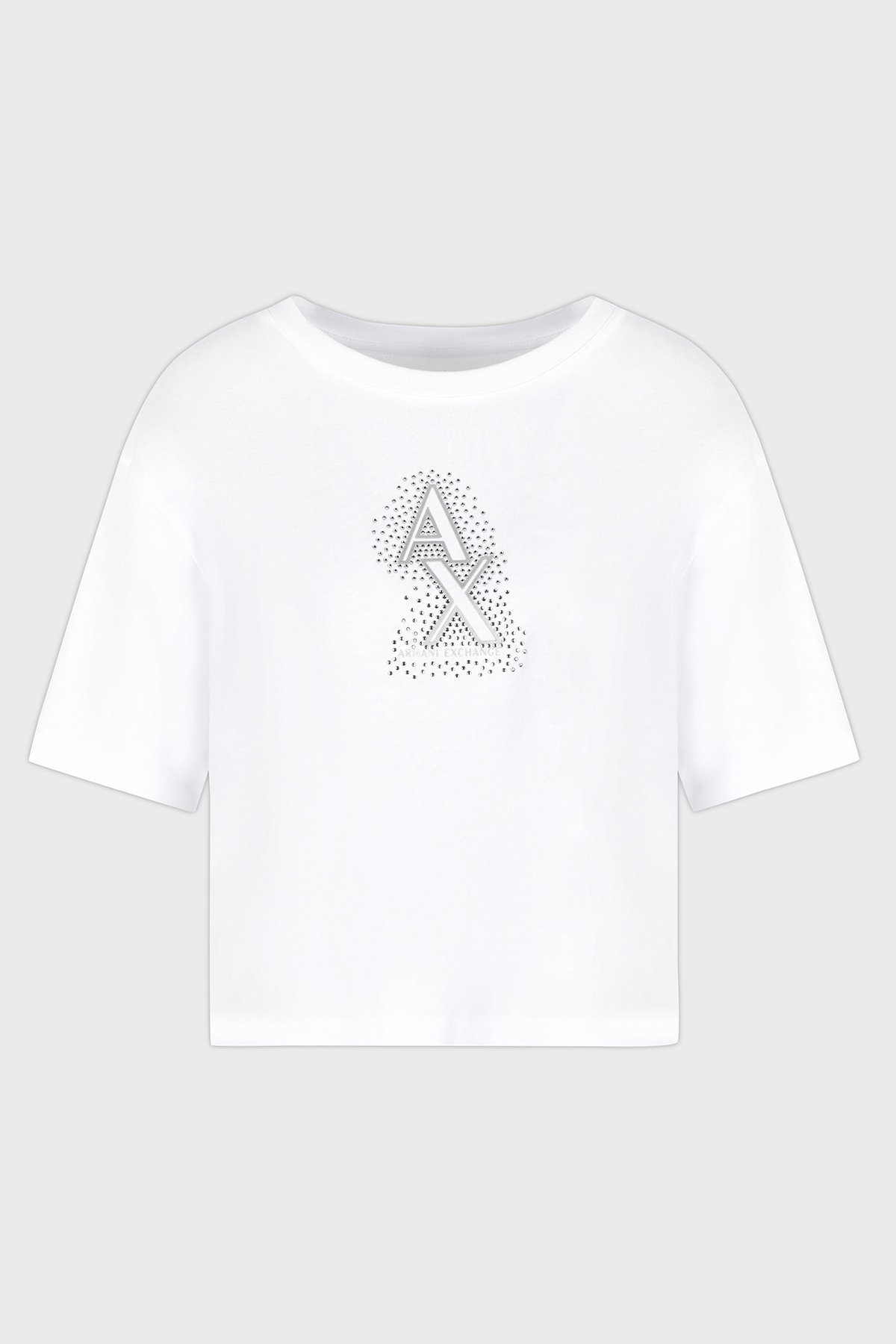 Armani Exchage % 100 Pamuk Cropped Fit Bisiklet Yaka Taşlı Logolu Bayan T Shirt XW000102 AF10359 U0002 BEYAZ