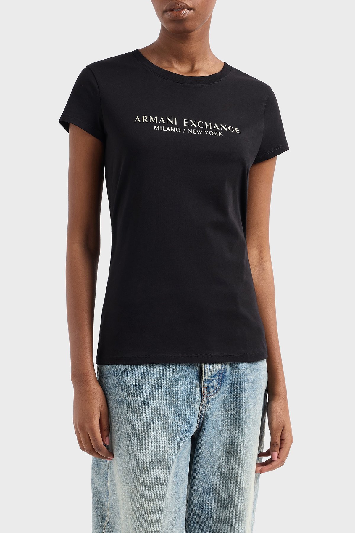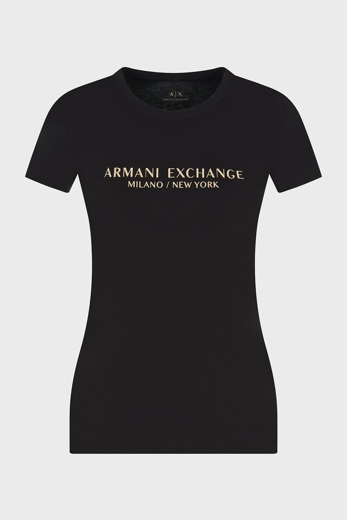 Armani Exchage Logo Baskılı % 100 Pamuk Slim Fit Yuvarlak Yaka Bayan T Shirt 8NYTAB YJG3Z 52AK SİYAH-GOLD