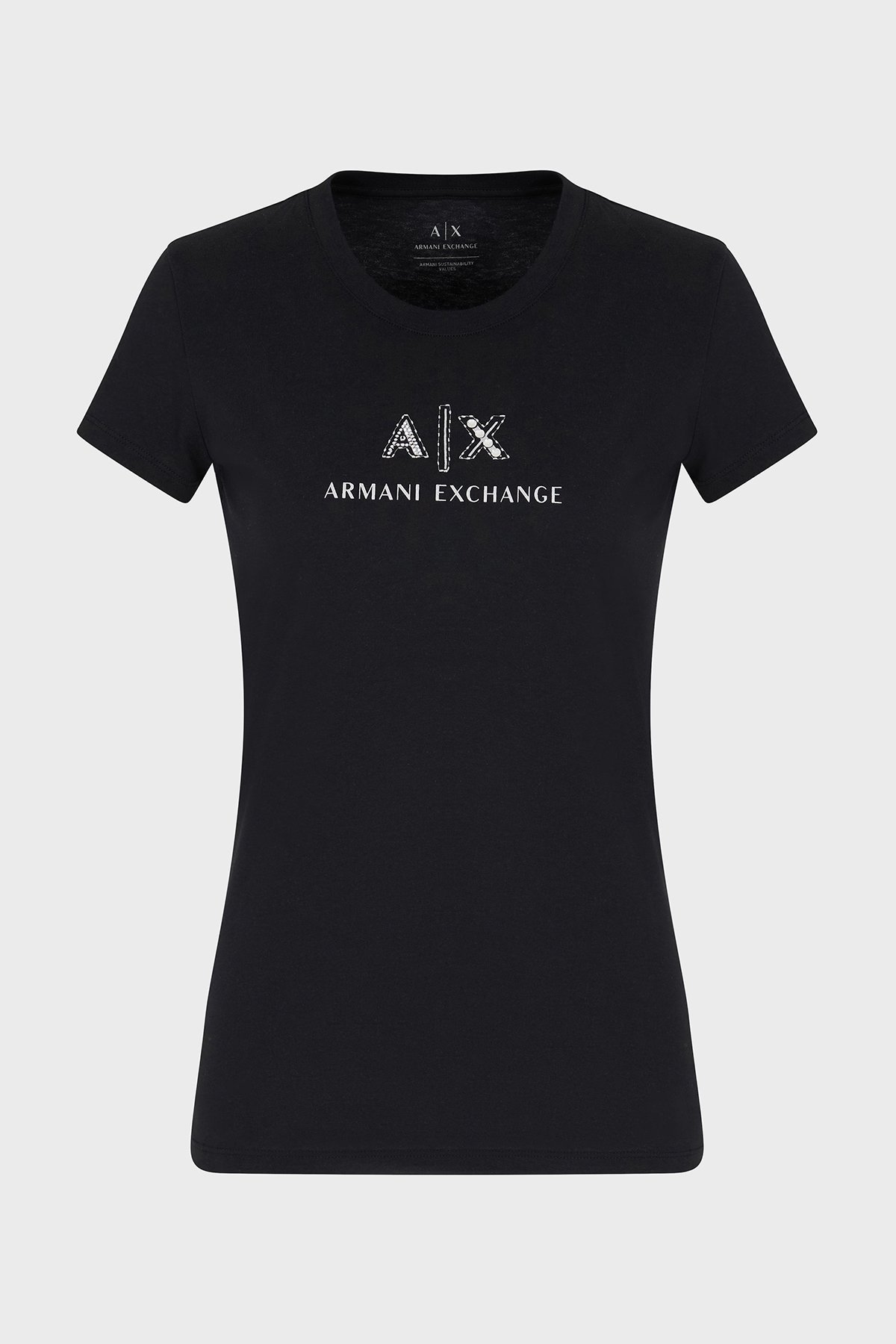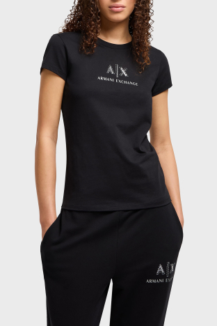 Armani Exchage Taşlı % 100 Pamuk Slim Fit Bisiklet Yaka Bayan T Shirt XW000386 AF10354 UC001 SİYAH