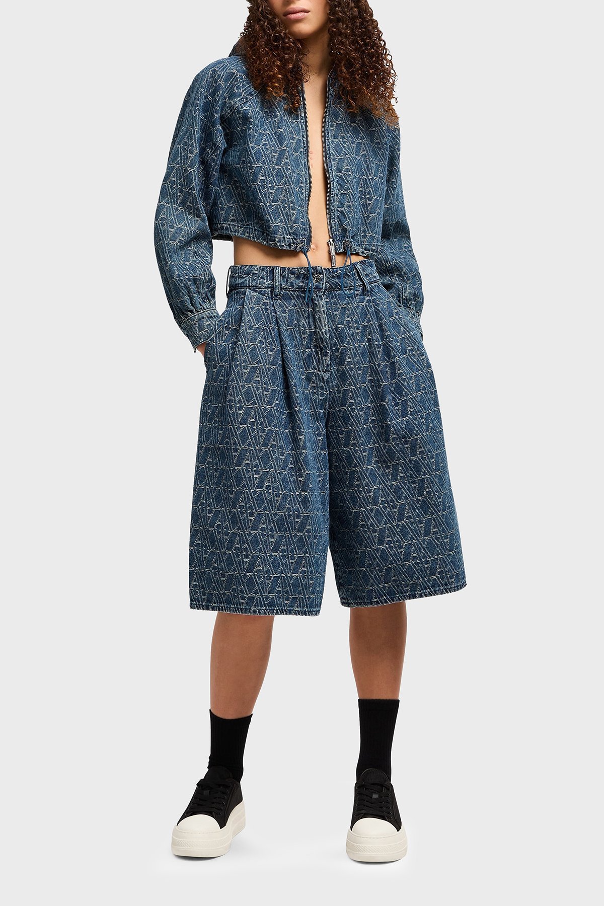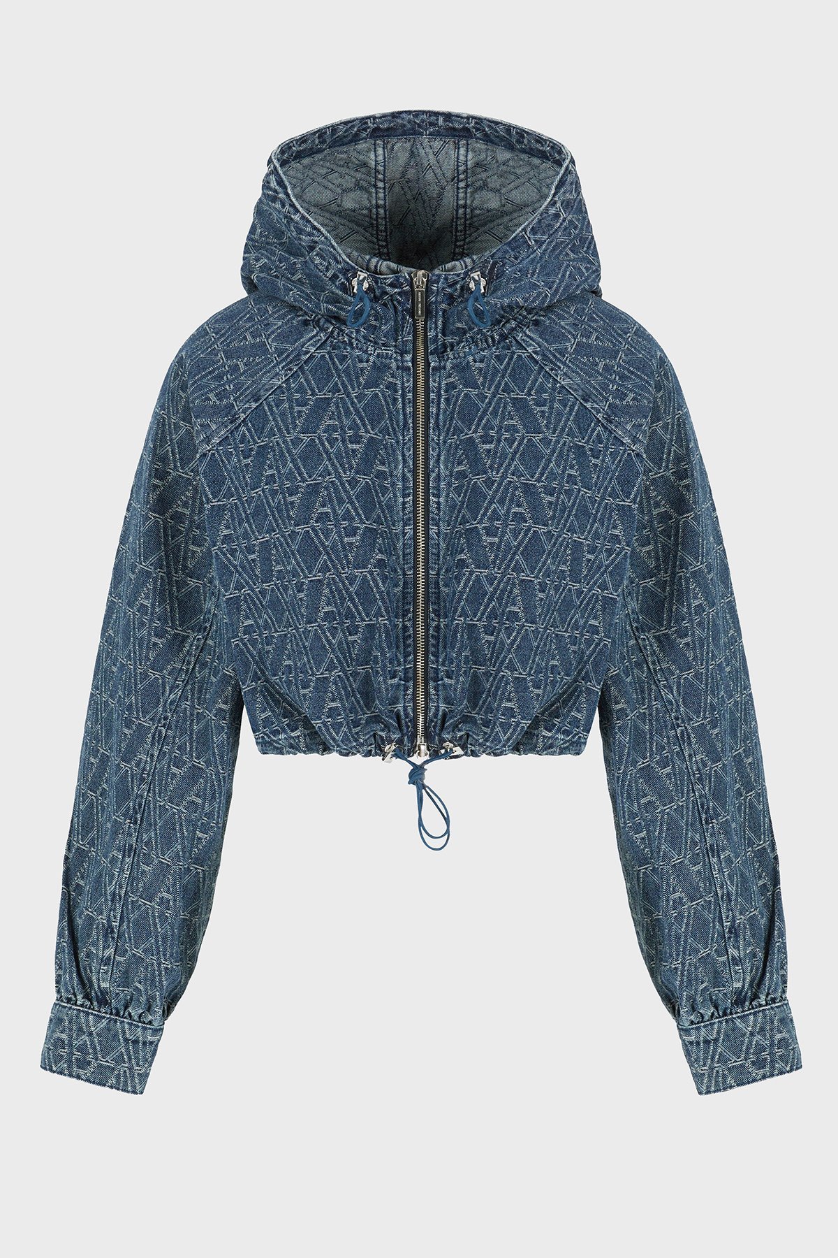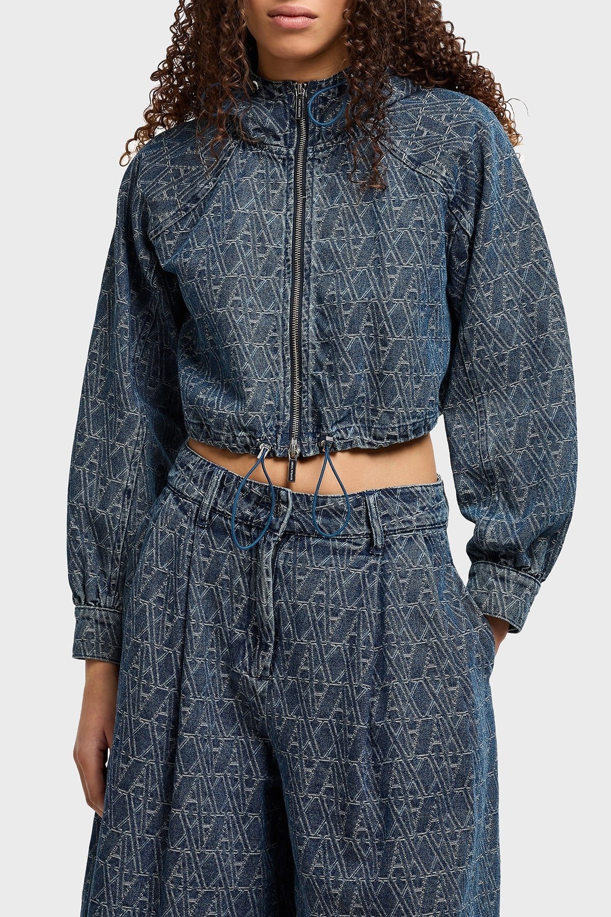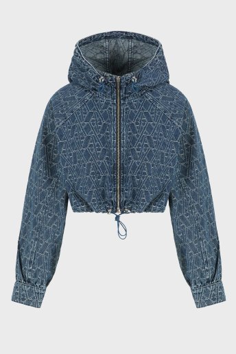 Armani Exchance % 100 Pamuk Tamamı Jakarlı Kapüşonlu Crop Bayan Kot Ceket XW001185 AF12844 FB055 LACİVERT