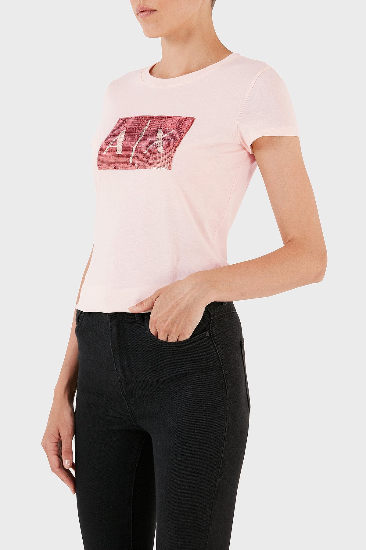 Pul Payetli Pamuklu Slim Fit Bisiklet Yaka Bayan T Shirt 8NYTDL YJ73Z 14AS AÇIK PEMBE
