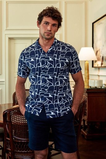Mars Desenli % 100 Keten Apaş Yaka Kısa Kollu Comfort Fit Erkek Gömlek BM23002135MS 925 LACİVERT-BEYAZ