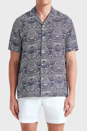 Mars Desenli % 100 Keten Apaş Yaka Kısa Kollu Comfort Fit Erkek Gömlek BM23002135MS 946 LACİVERT