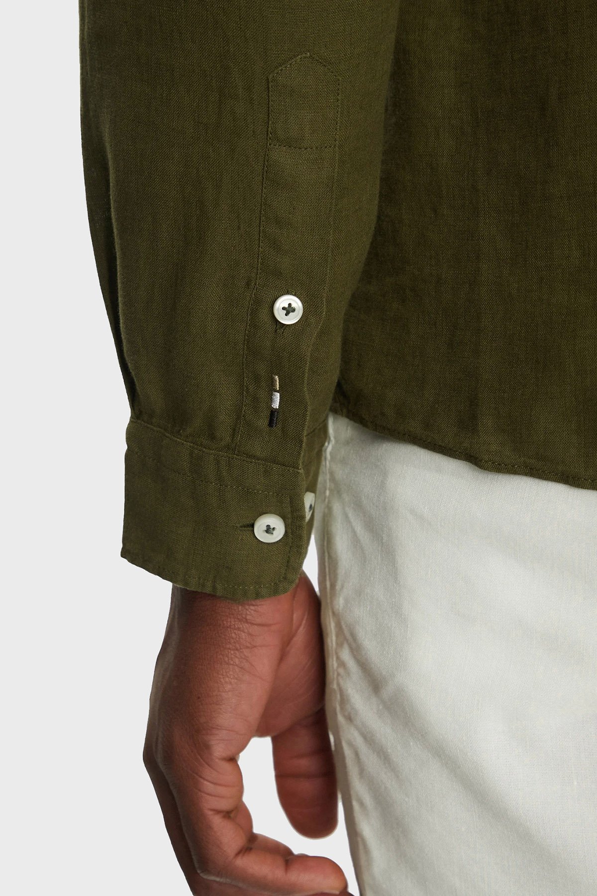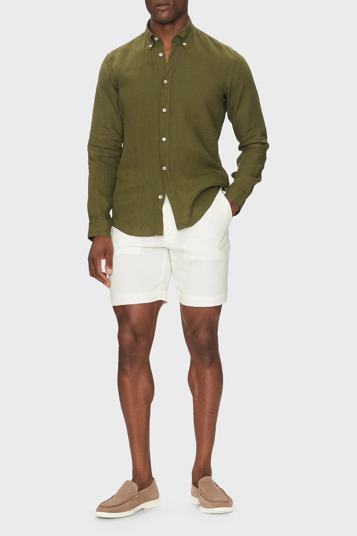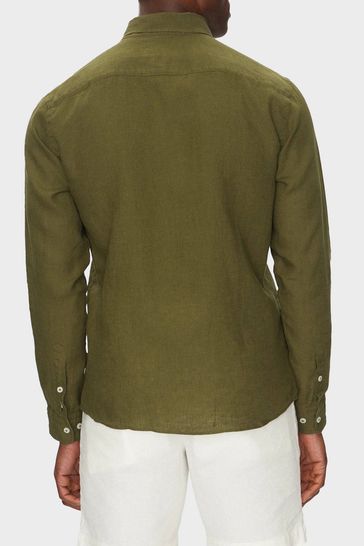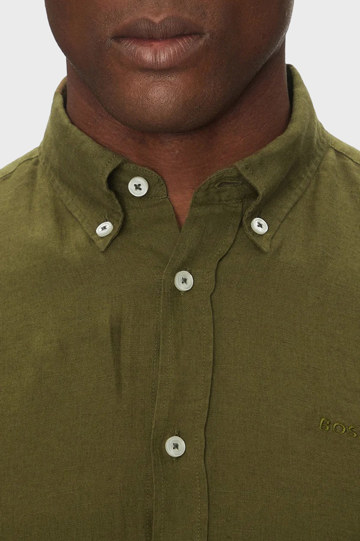 % 100 Keten Regular Fit Düğmeli Yaka Logolu Erkek Gömlek 50520283 302 KOYU YEŞİL