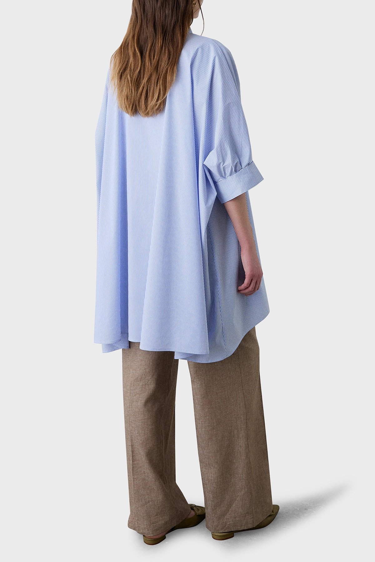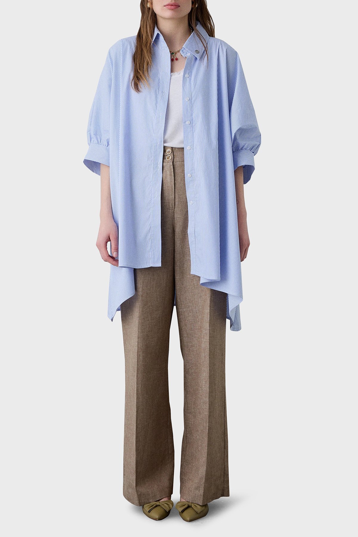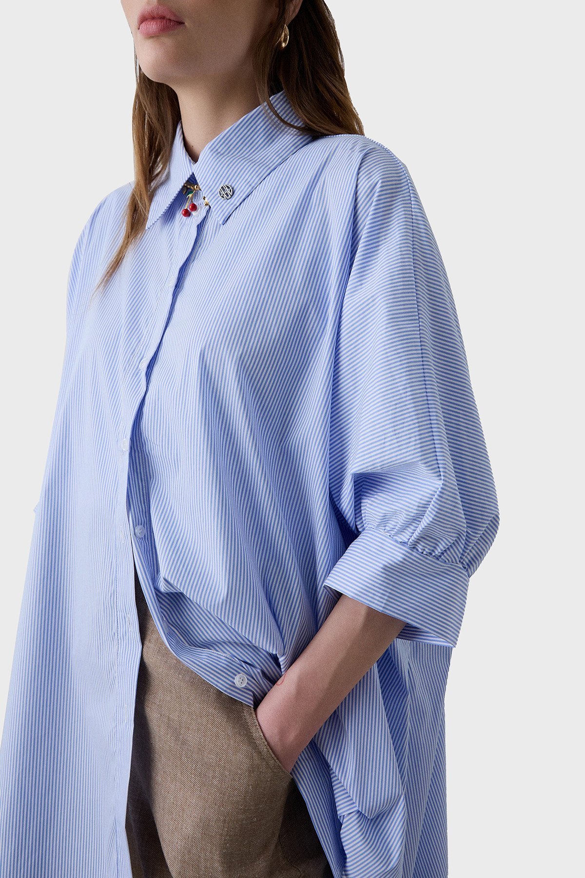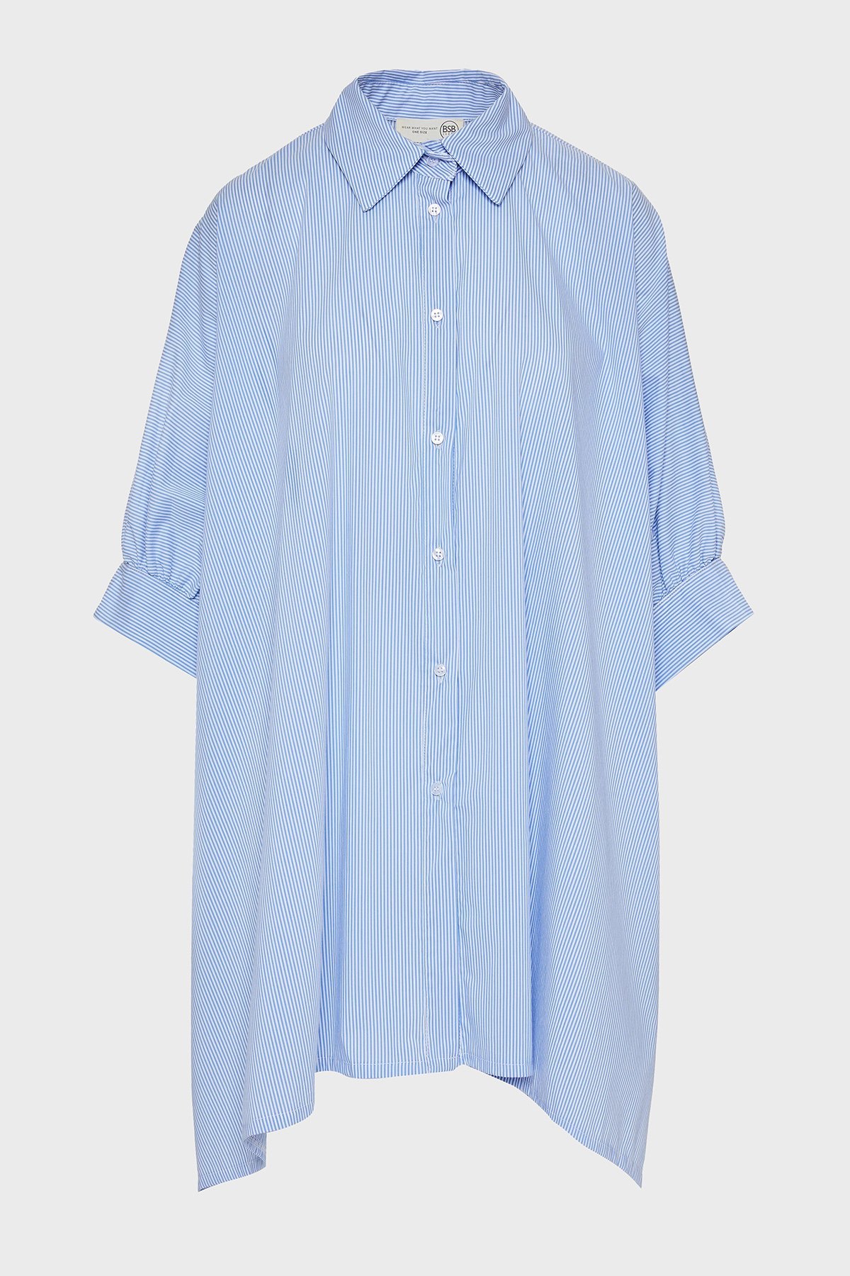 Çizgili Pamuk Karışımlı Oversize Asimetrik Bayan Gömlek 053-216035.060 MAVİ