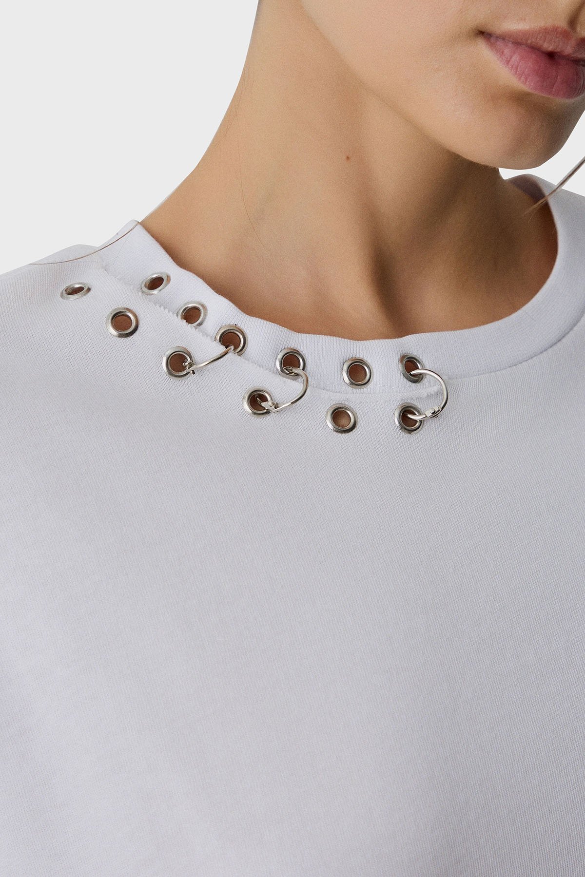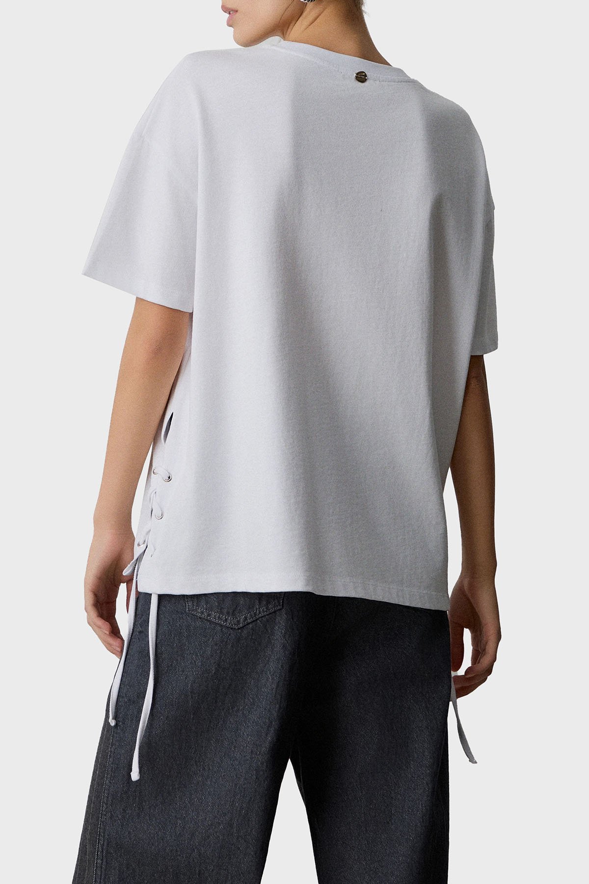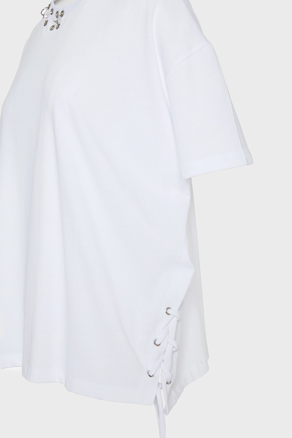 Metalik ve Bağlama Detaylı Pamuklu Oversize Fit Bisiklet Yaka Bayan Bluz 053-210049.002 BEYAZ