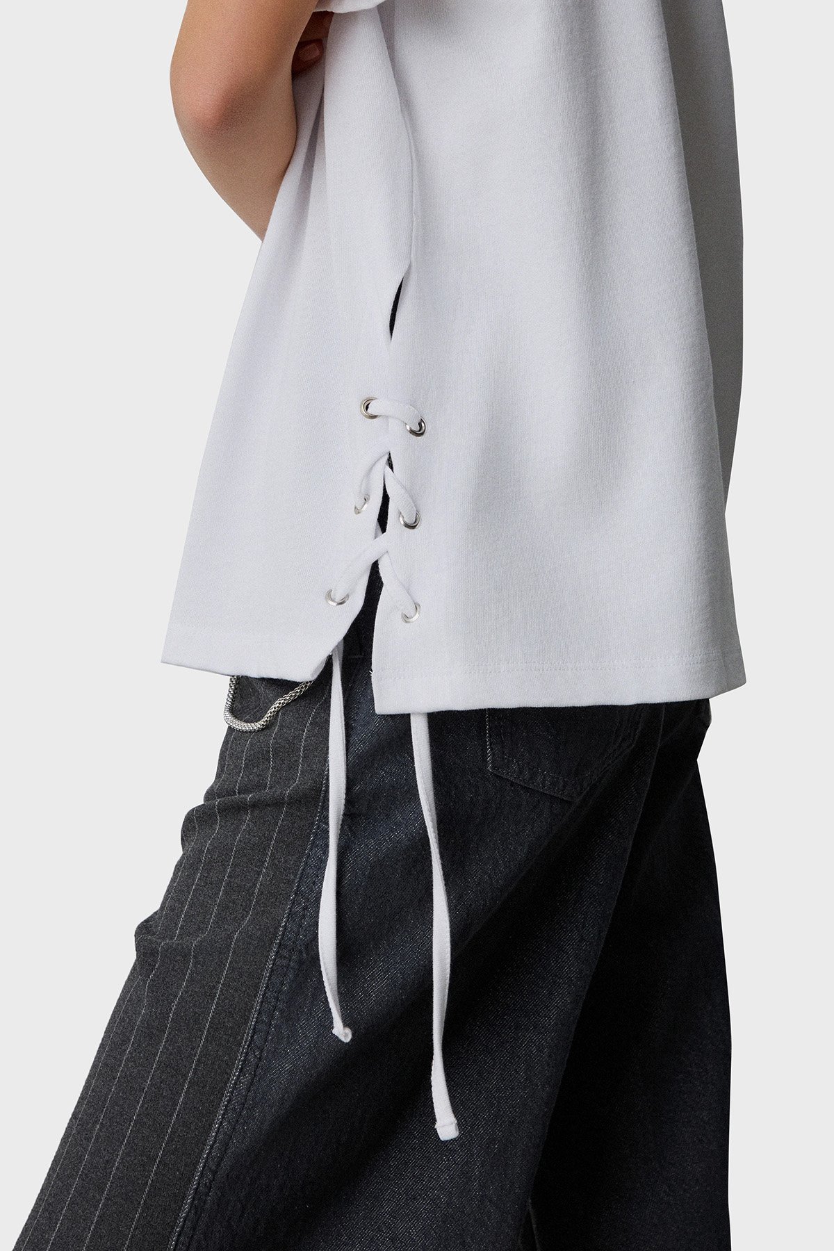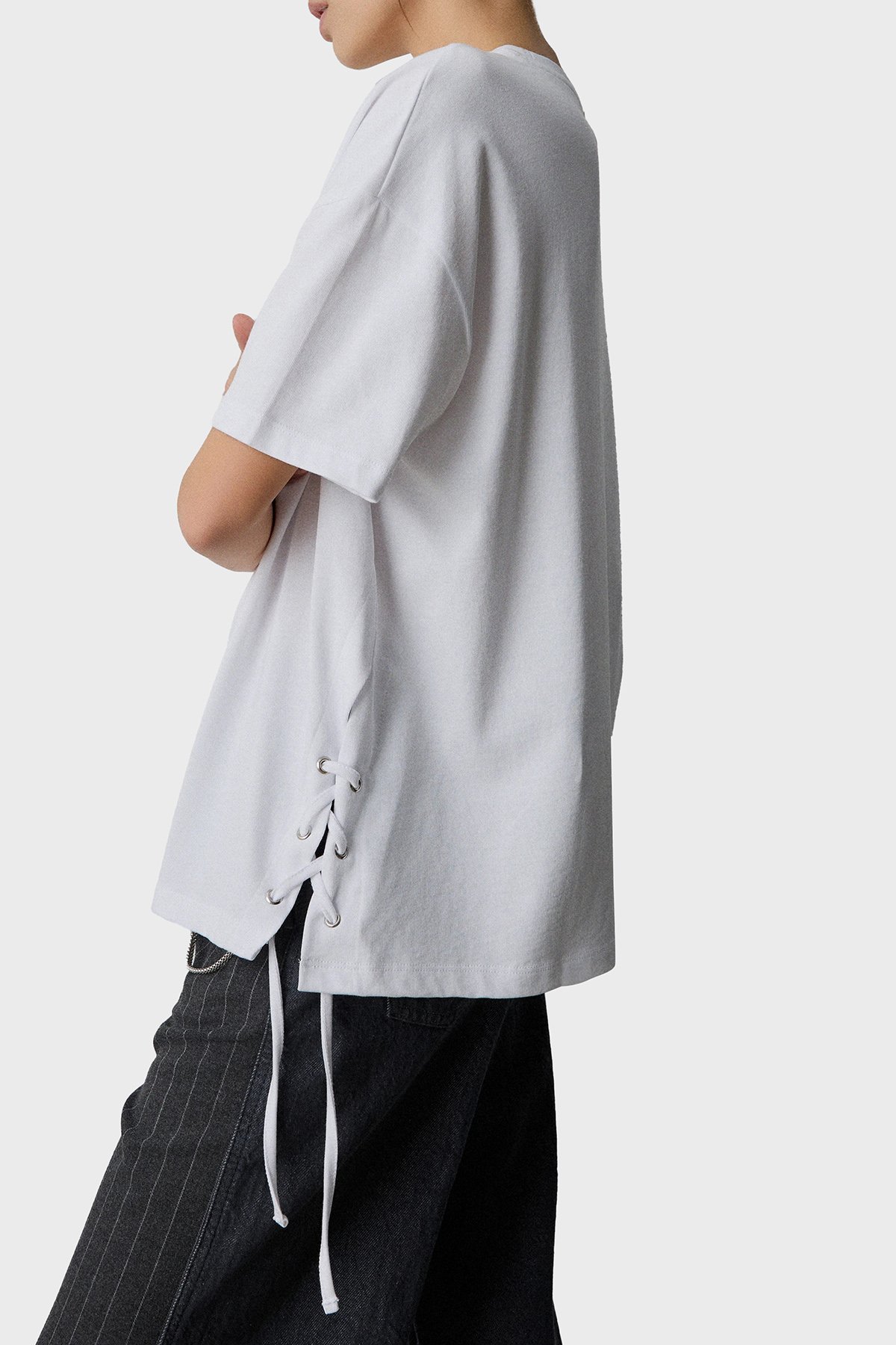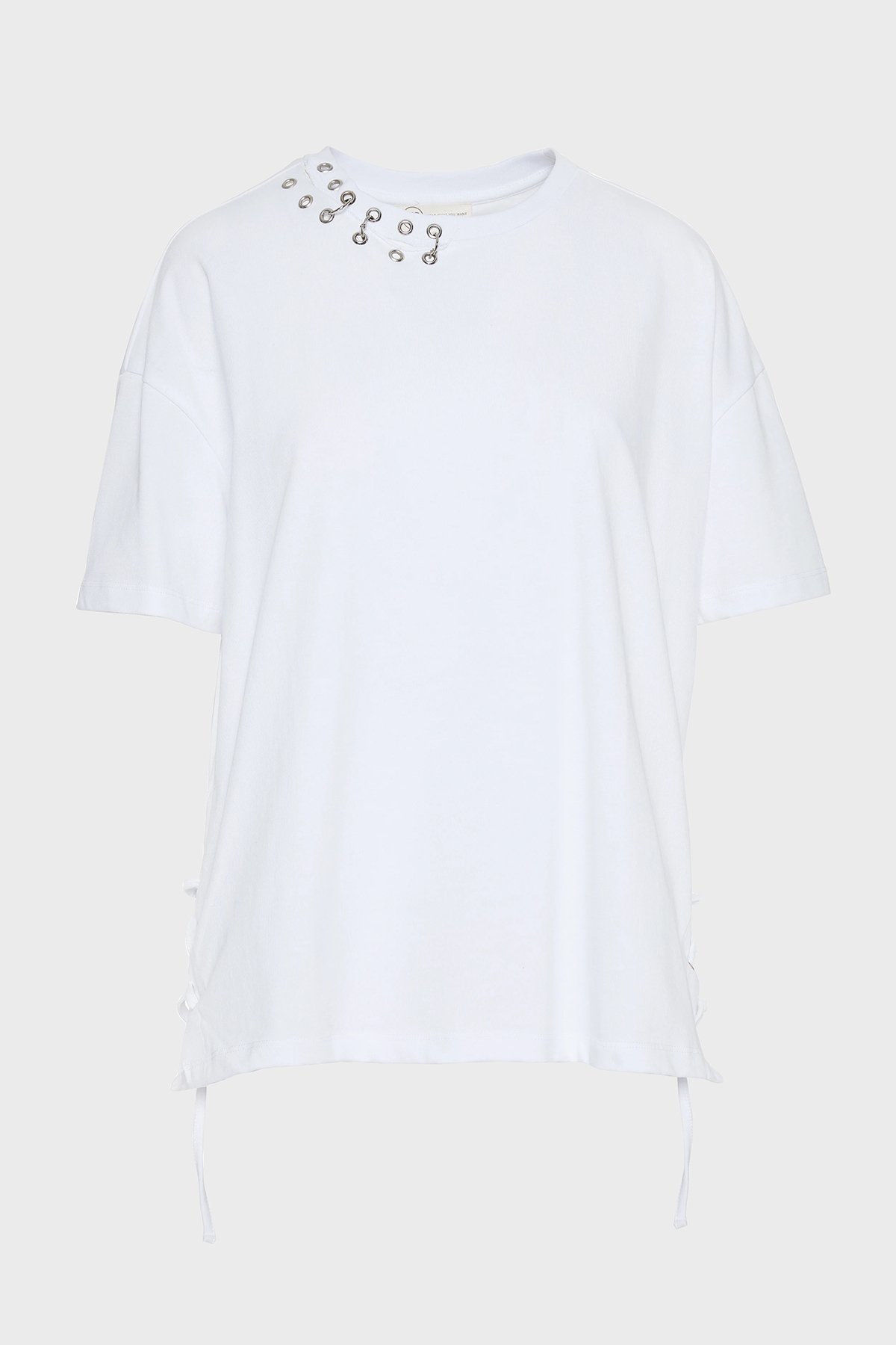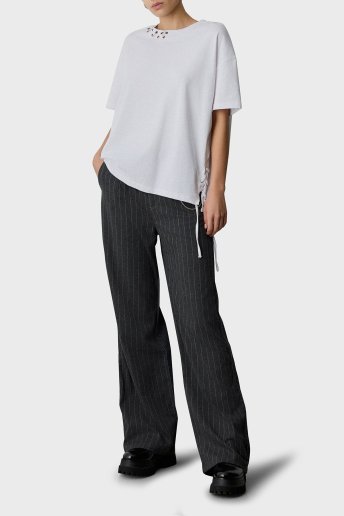 Metalik ve Bağlama Detaylı Pamuklu Oversize Fit Bisiklet Yaka Bayan Bluz 053-210049.002 BEYAZ