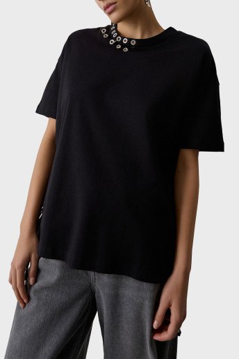 Metalik ve Bağlama Detaylı Pamuklu Oversize Fit Bisiklet Yaka Bayan Bluz 053-210049.080 SİYAH