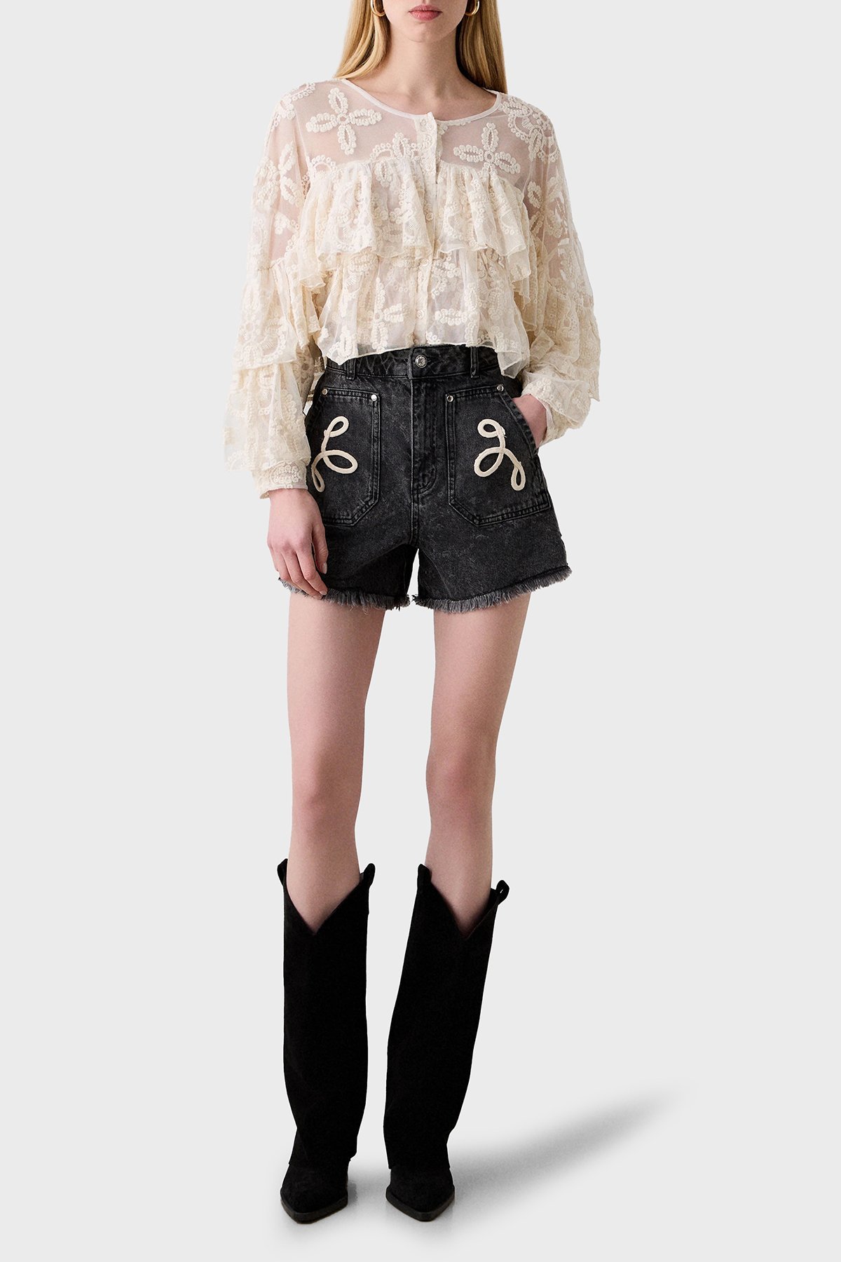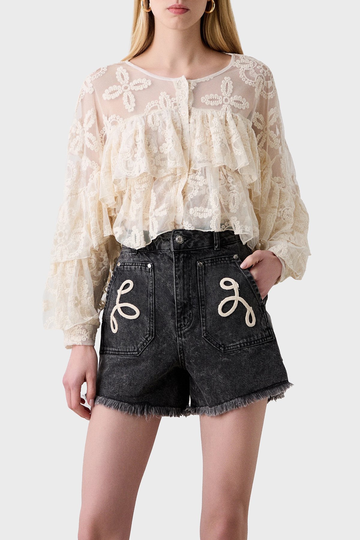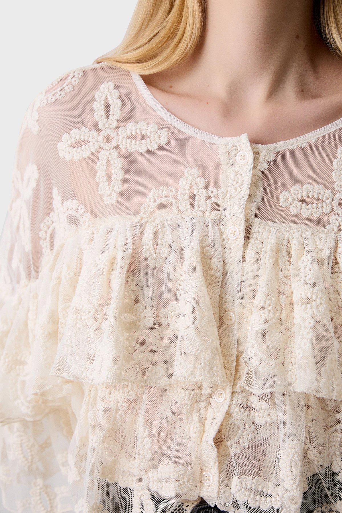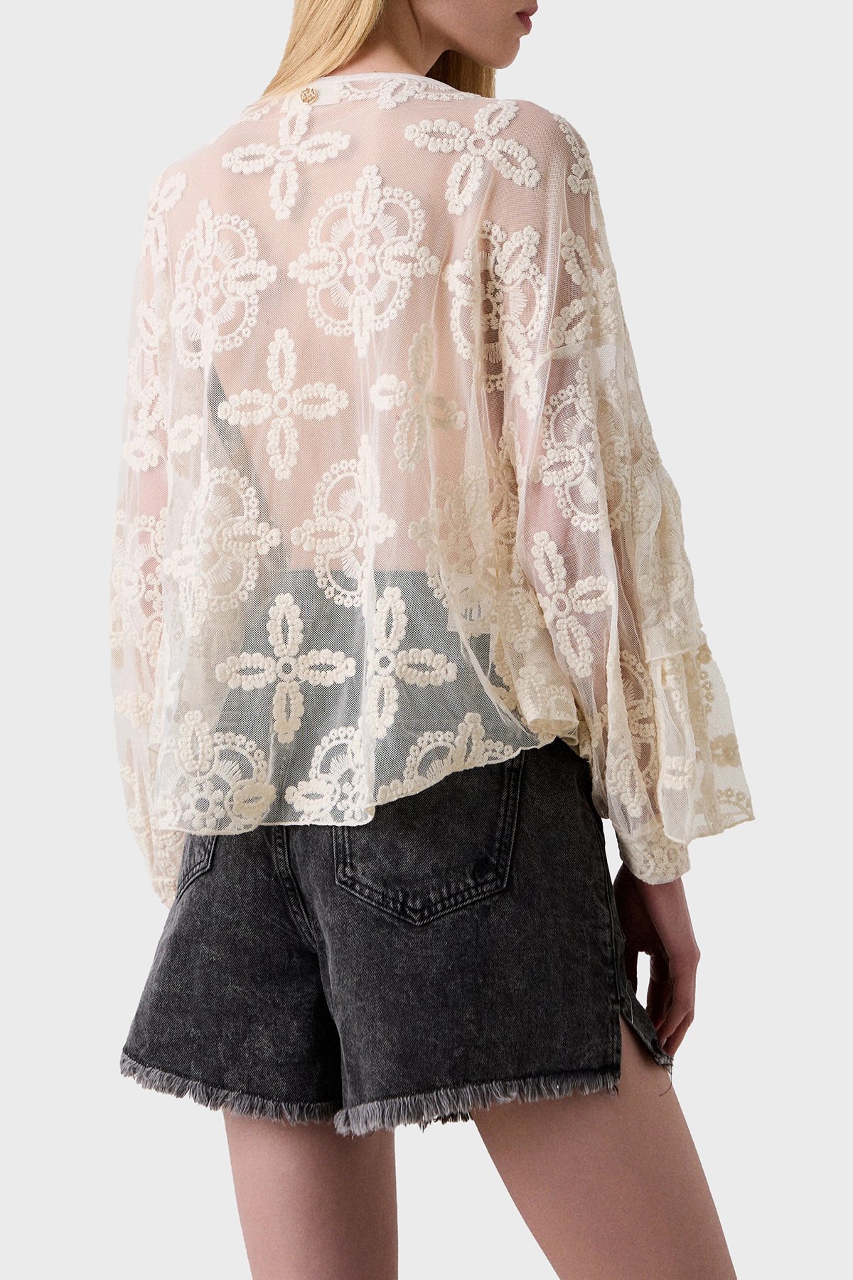 -İşlemeli, yarı transparan tasarımlı gömlek