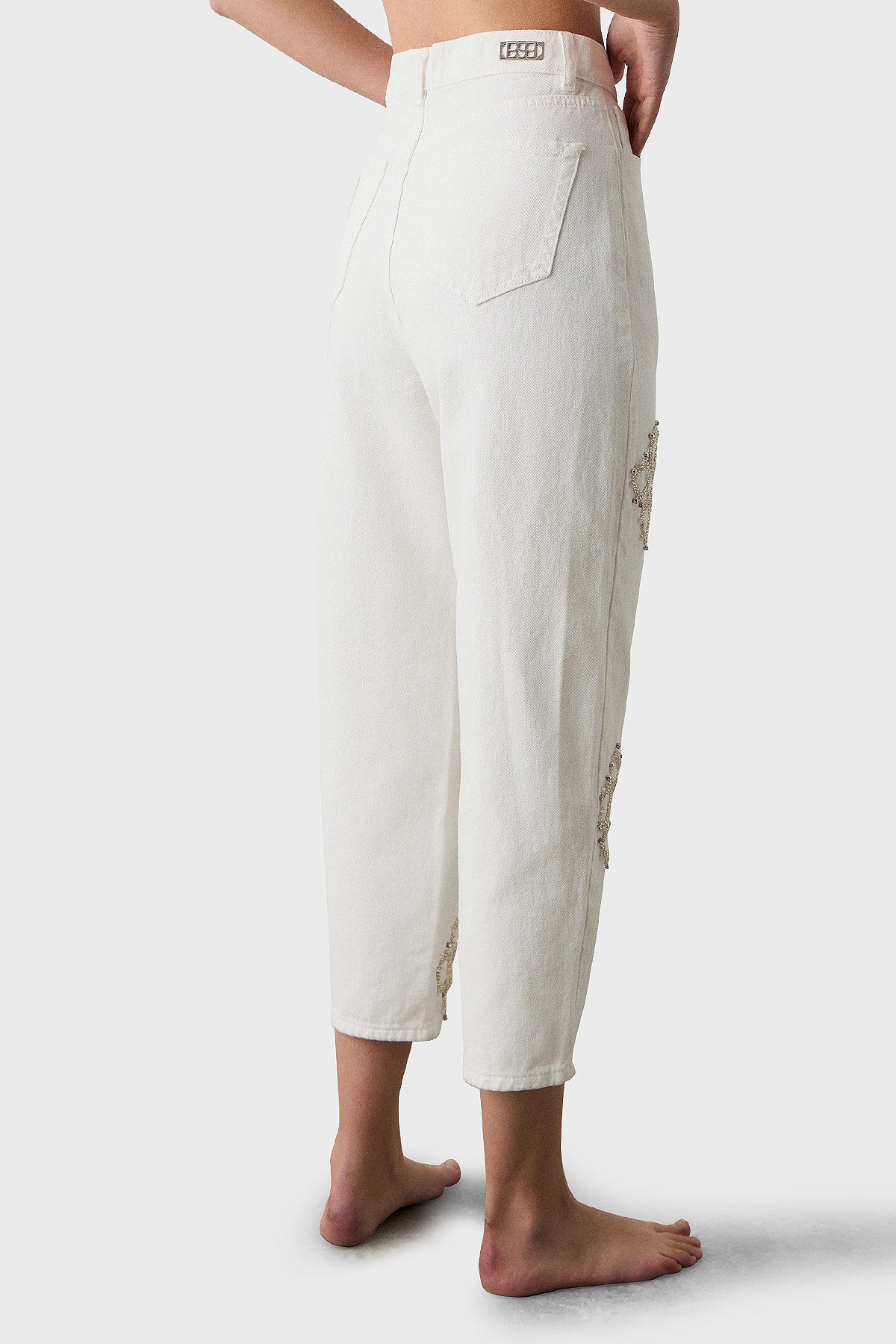 Taşlı % 100 Pamuk Slim Fit Yüksk Bel Boru Paça Bayan Pantolon 053-212835.004 EKRU