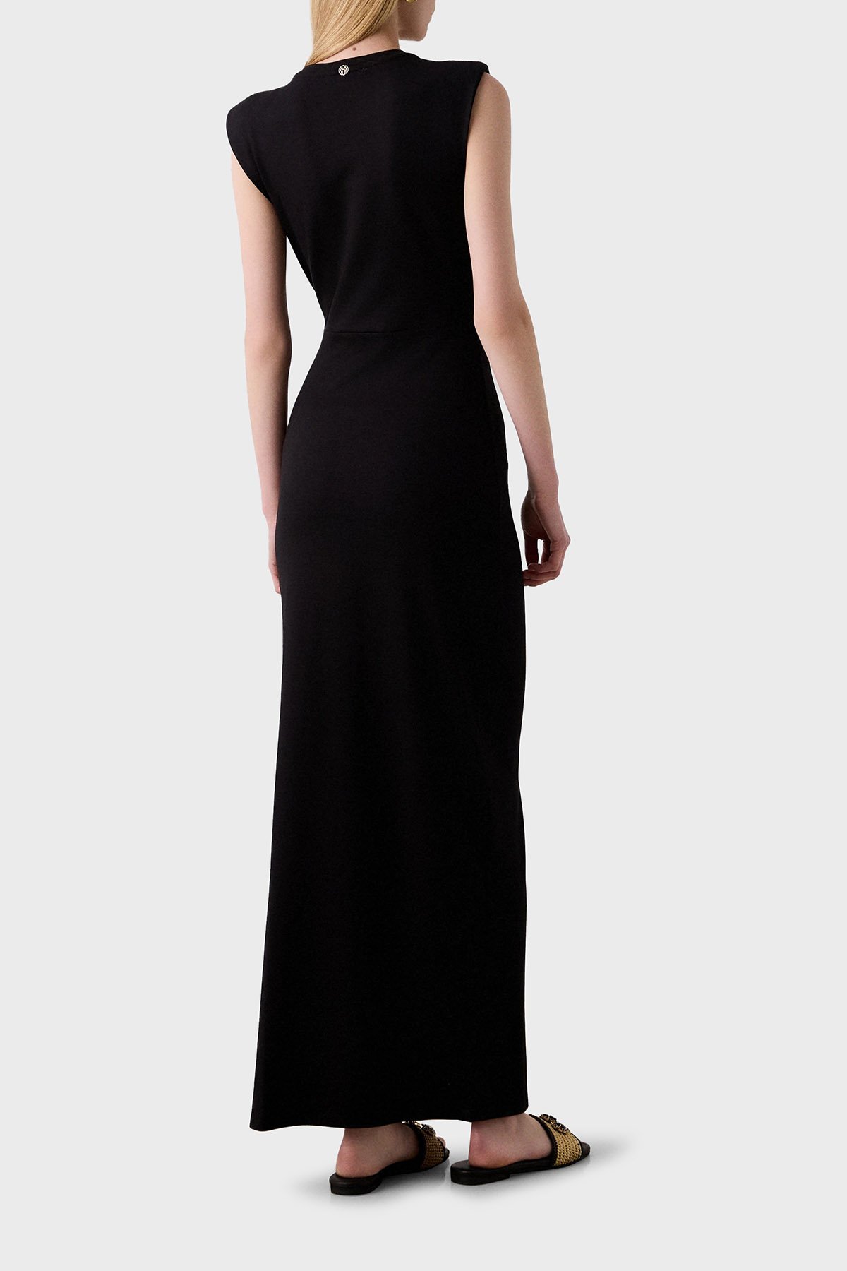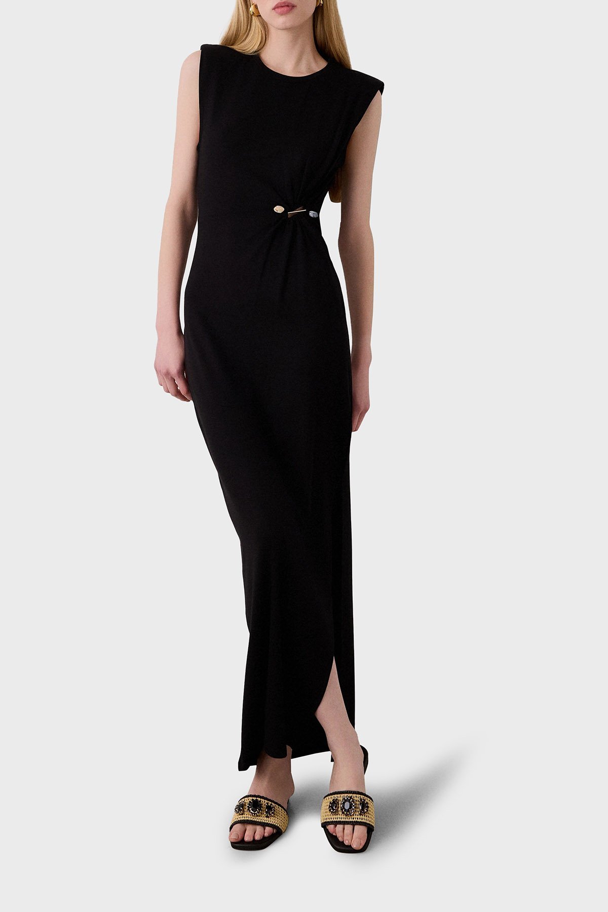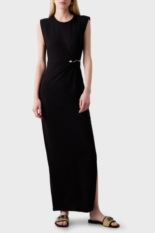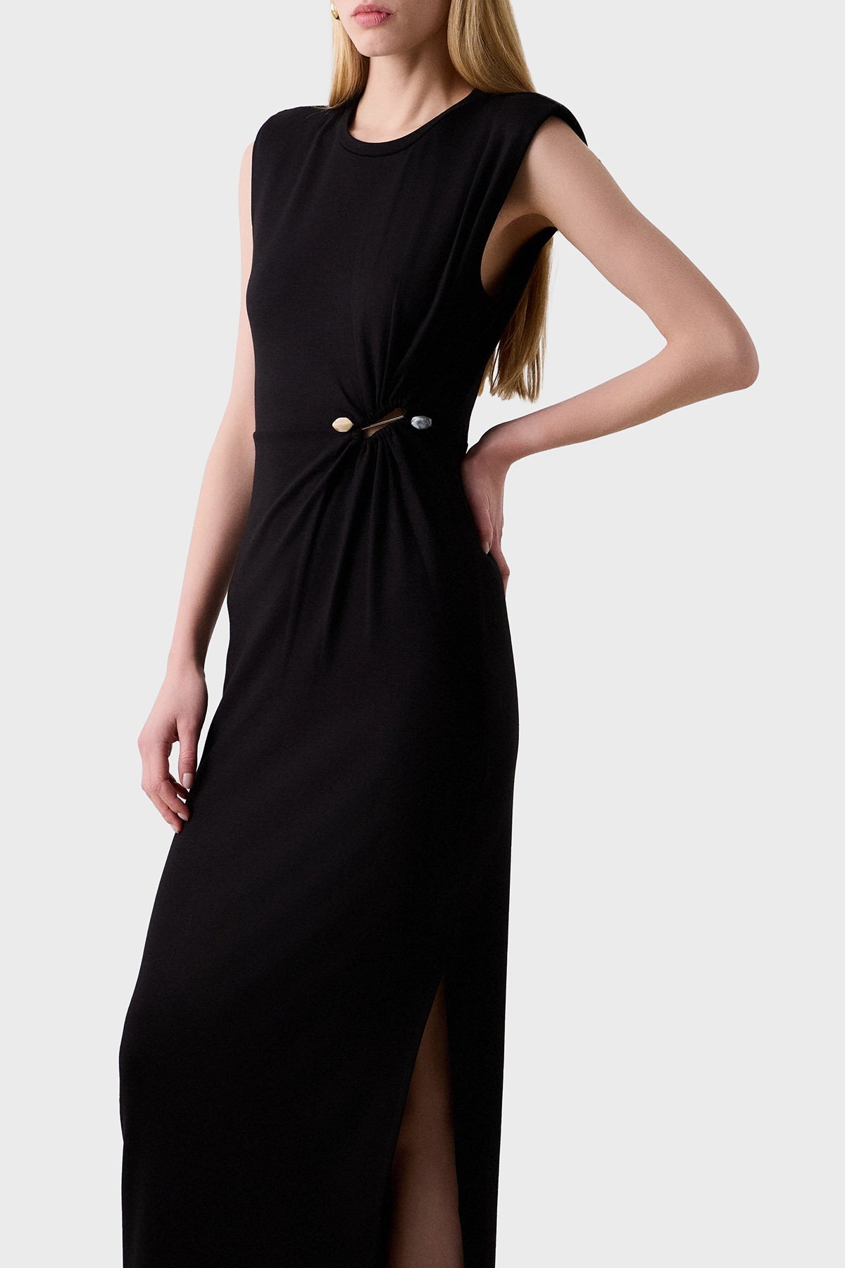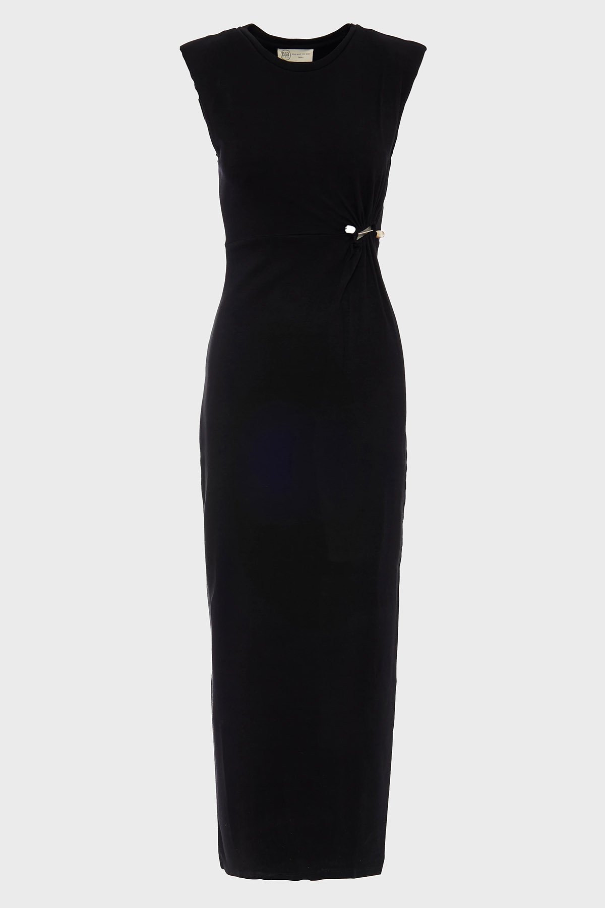 Yıtmaçlı Fitted Fit Büzgülü Aksesuar Detaylı Bisiklet Yaka Uzun Bayan Elbise 053-211026.080 SİYAH