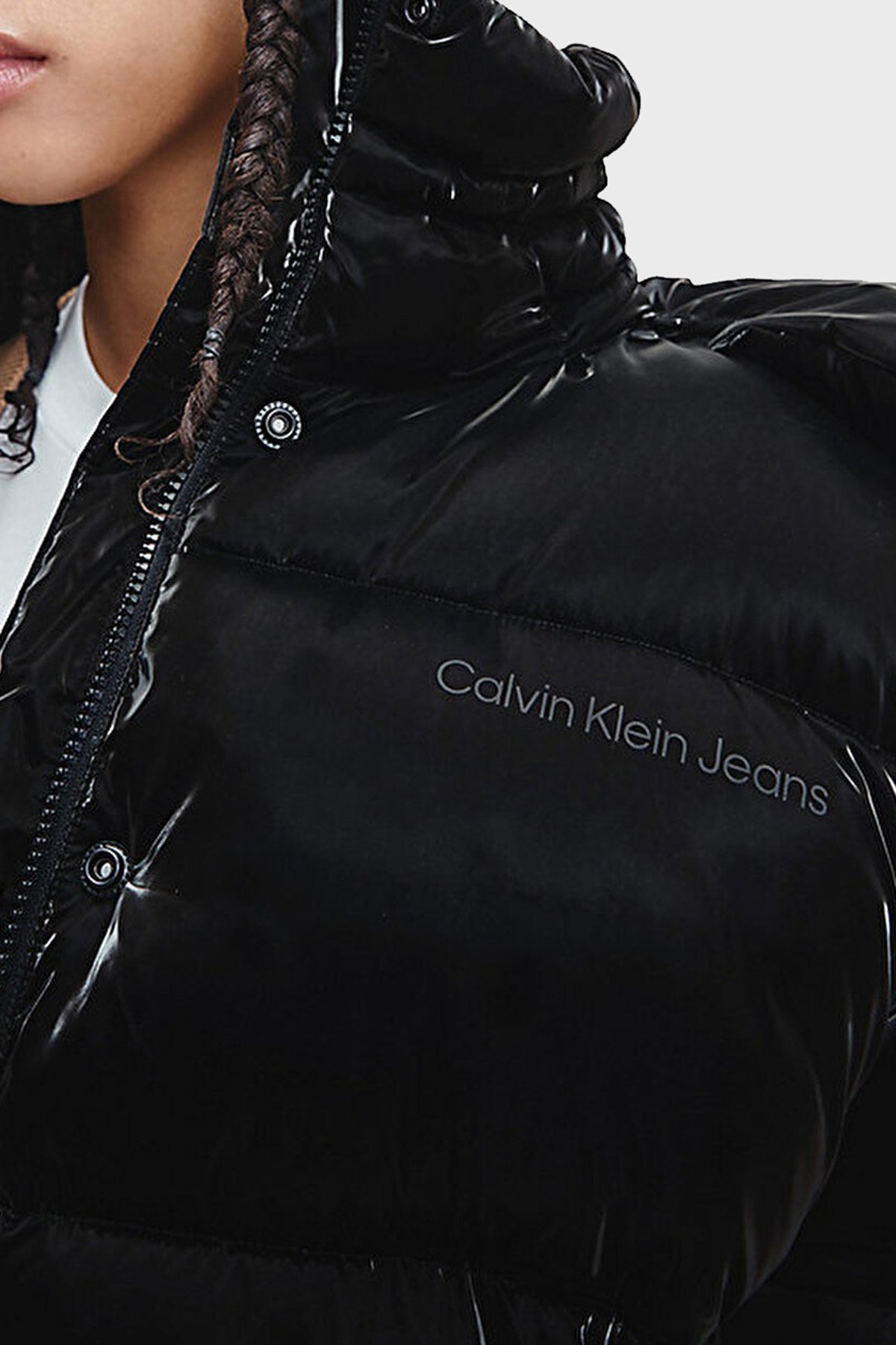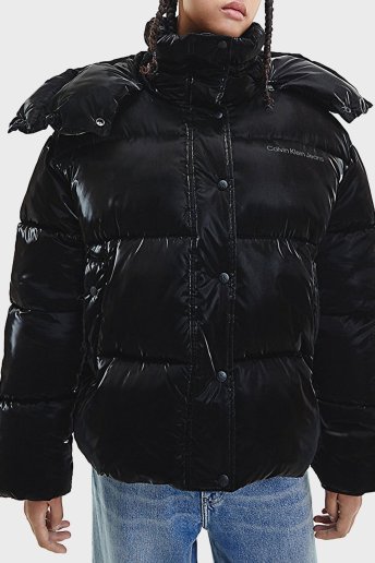 Logolu Oversize Parlak Görünümlü Çıkarılabilir Kapüşonlu Bayan Mont J20J219838 BEH SİYAH