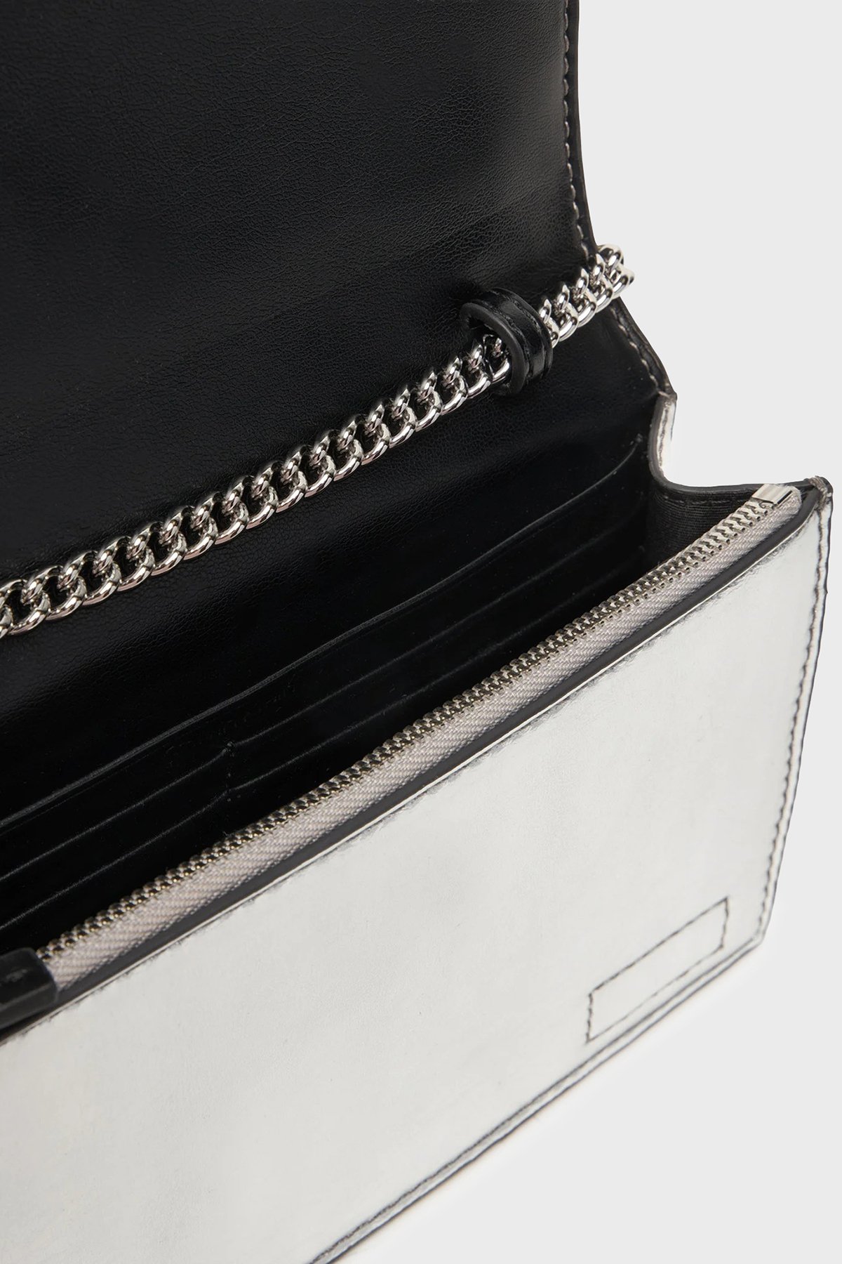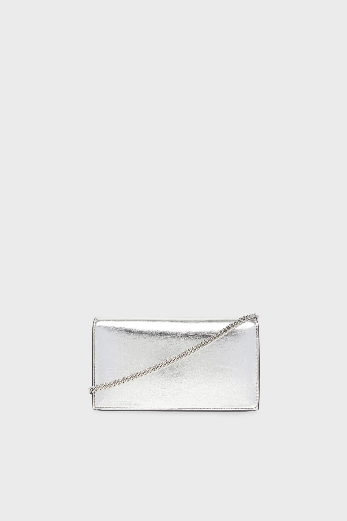 Detaylar: - Metalik tasarım- Monogram logo plakası- Kapaklı kapatma, zincir askı- İç fermuarlı cep- İç kağıt para bölmesi, çoklu kart yuvaları