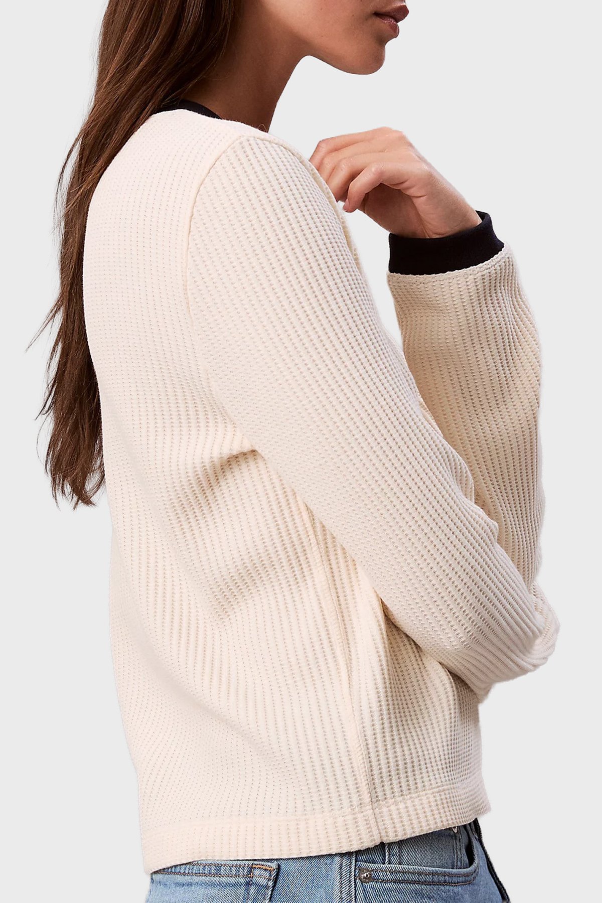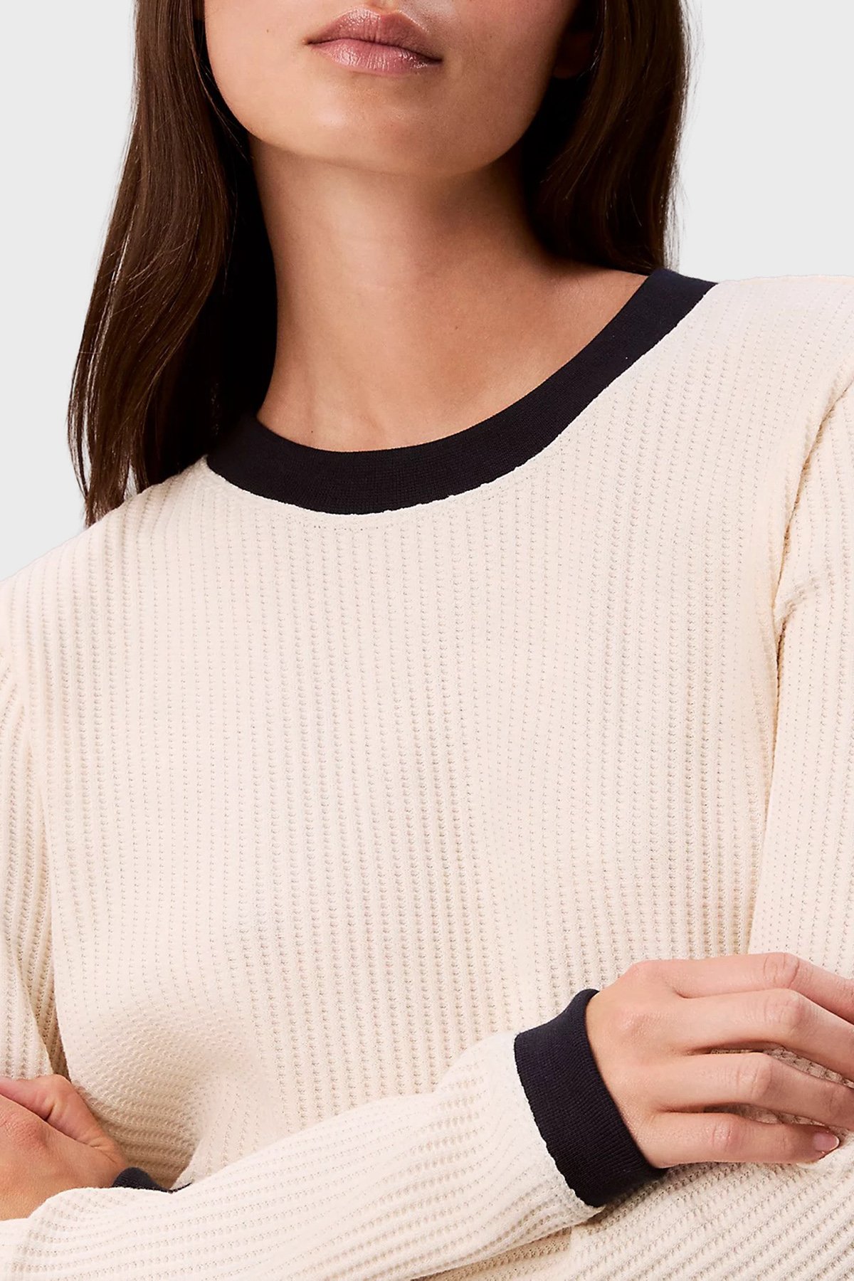Detaylar: Kontrast renkte ribana yaka ve manşetler