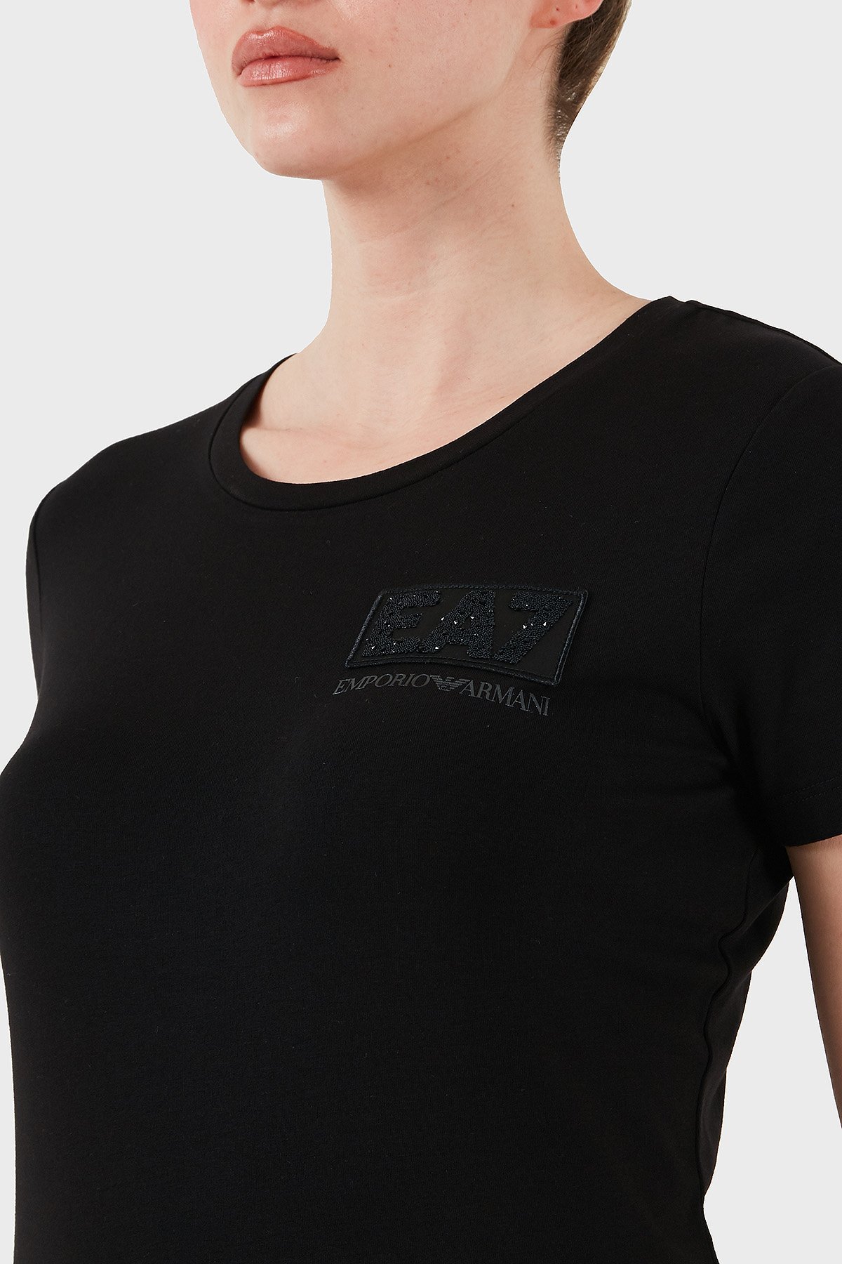 Taşlı Logolu Streç Pamuklu Regular Fit Yuvarlak Yaka Bayan T Shirt 7W000492 AF10373 UC001 SİYAH