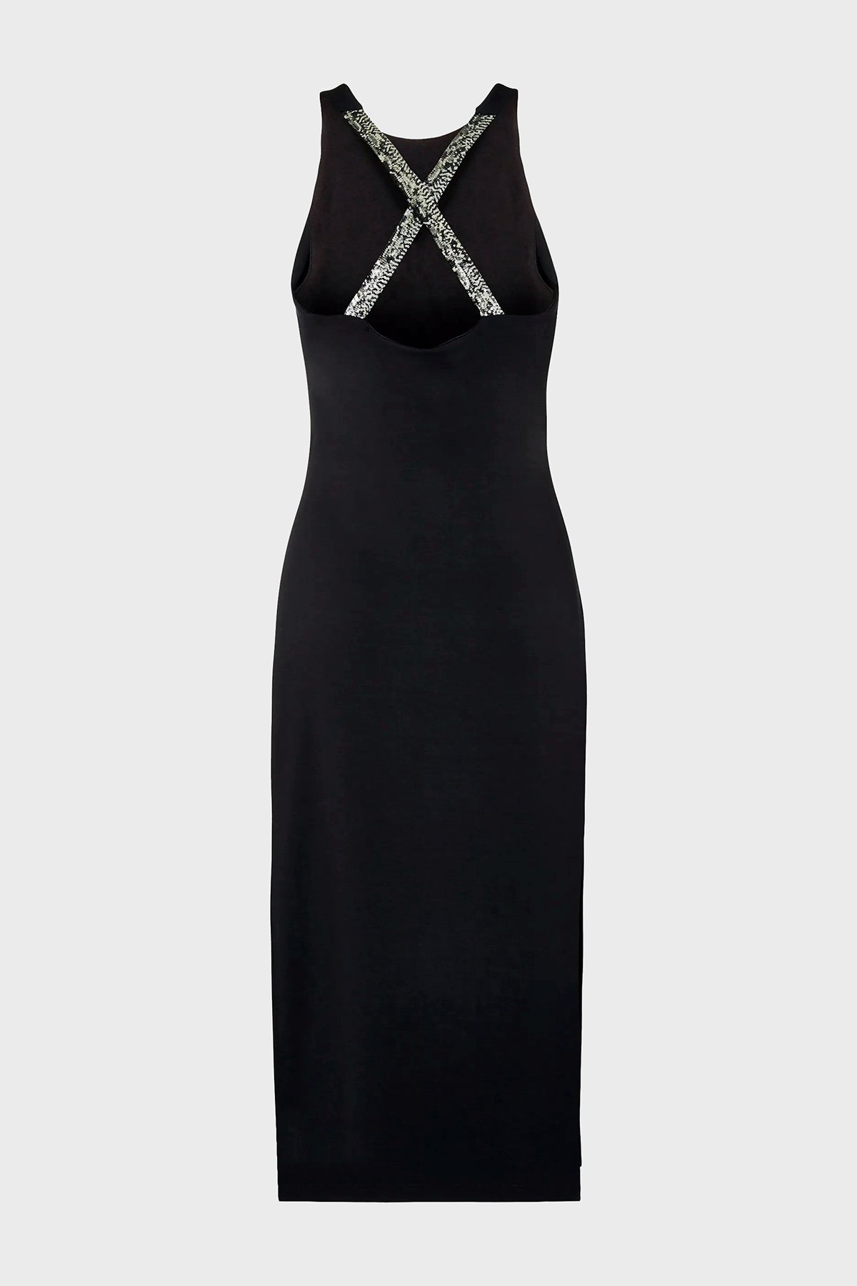 Vücuda Oturan Streç Yırtmaçlı Çapraz Sırt Detaylı Midi Bayan Elbise 3RTA57 TJLQZ 1200 SİYAH