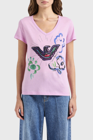 Baskılı Pamuklu Regular Fit V Yaka Bayan T Shirt 3D2T8F 2JTAZ 0824 PEMBE