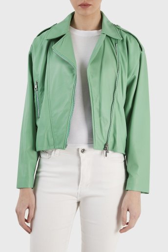 Düşük Omuz Fermuarlı Hakiki Bayan Deri Ceket D4NB64 D2P71 504 YEŞİL