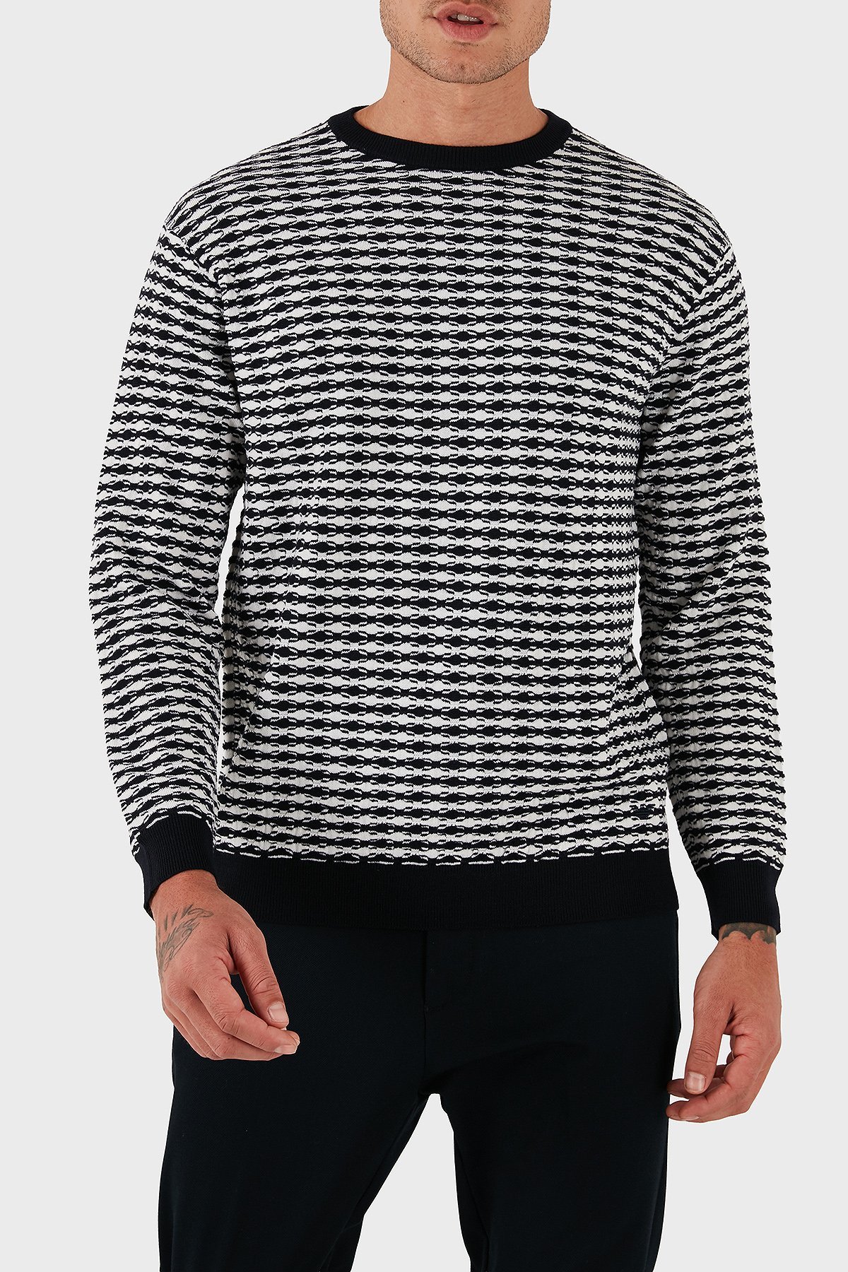 Jakarlı Yün Karışımlı Regular Fit Bisiklet Yaka Erkek Kazak EM003830 AF19833 F0015 BEYAZ-LACİVERT