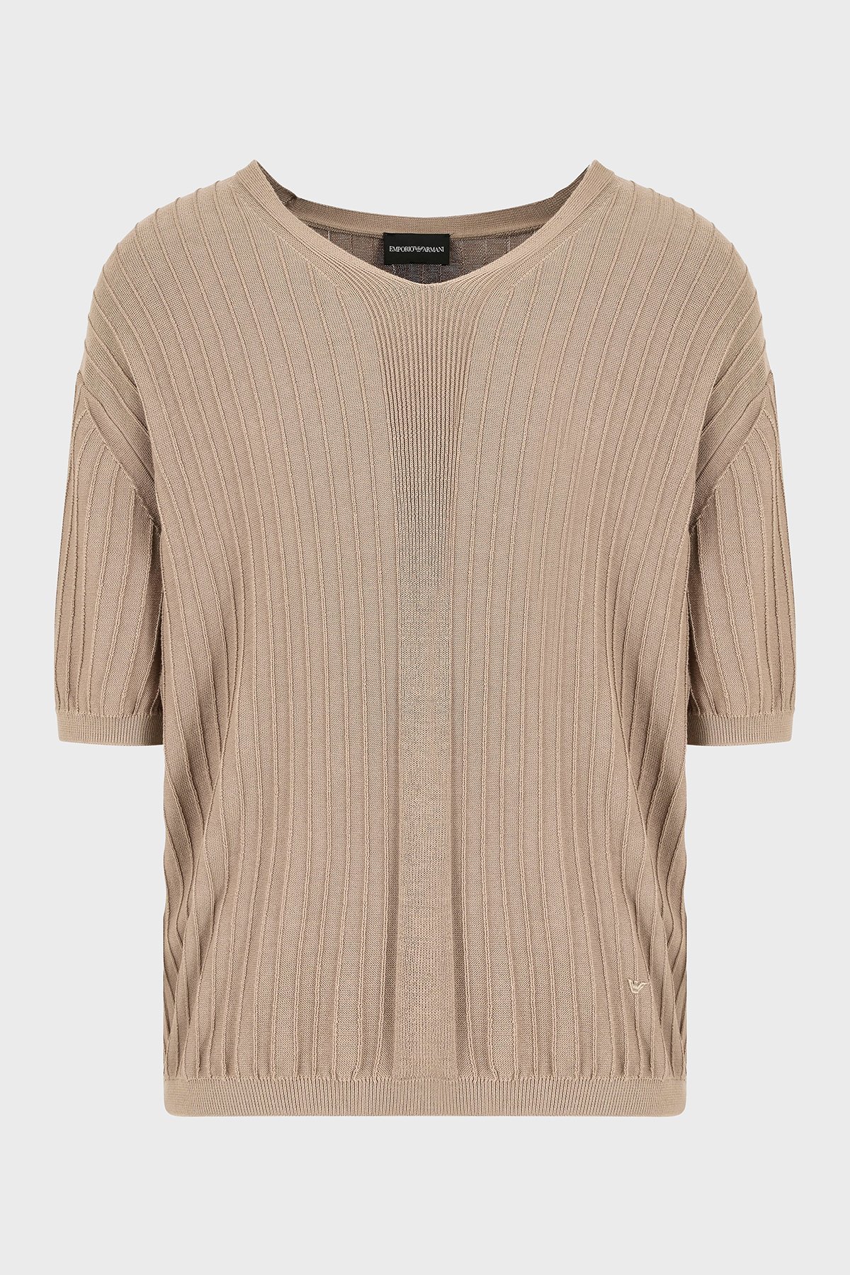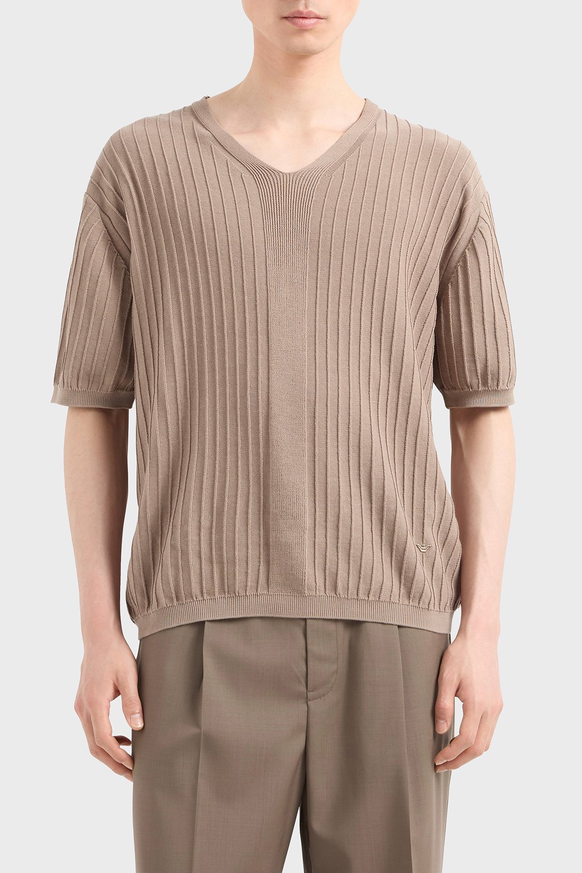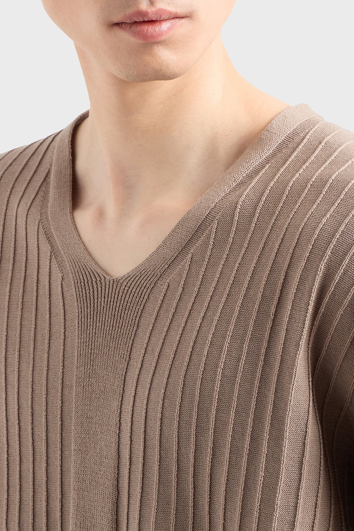 Pamuklu Regular Fit V Yaka Örgü Desenli Kısa Kollu Erkek Kazak EM000862 AF13822 U6167 BEJ