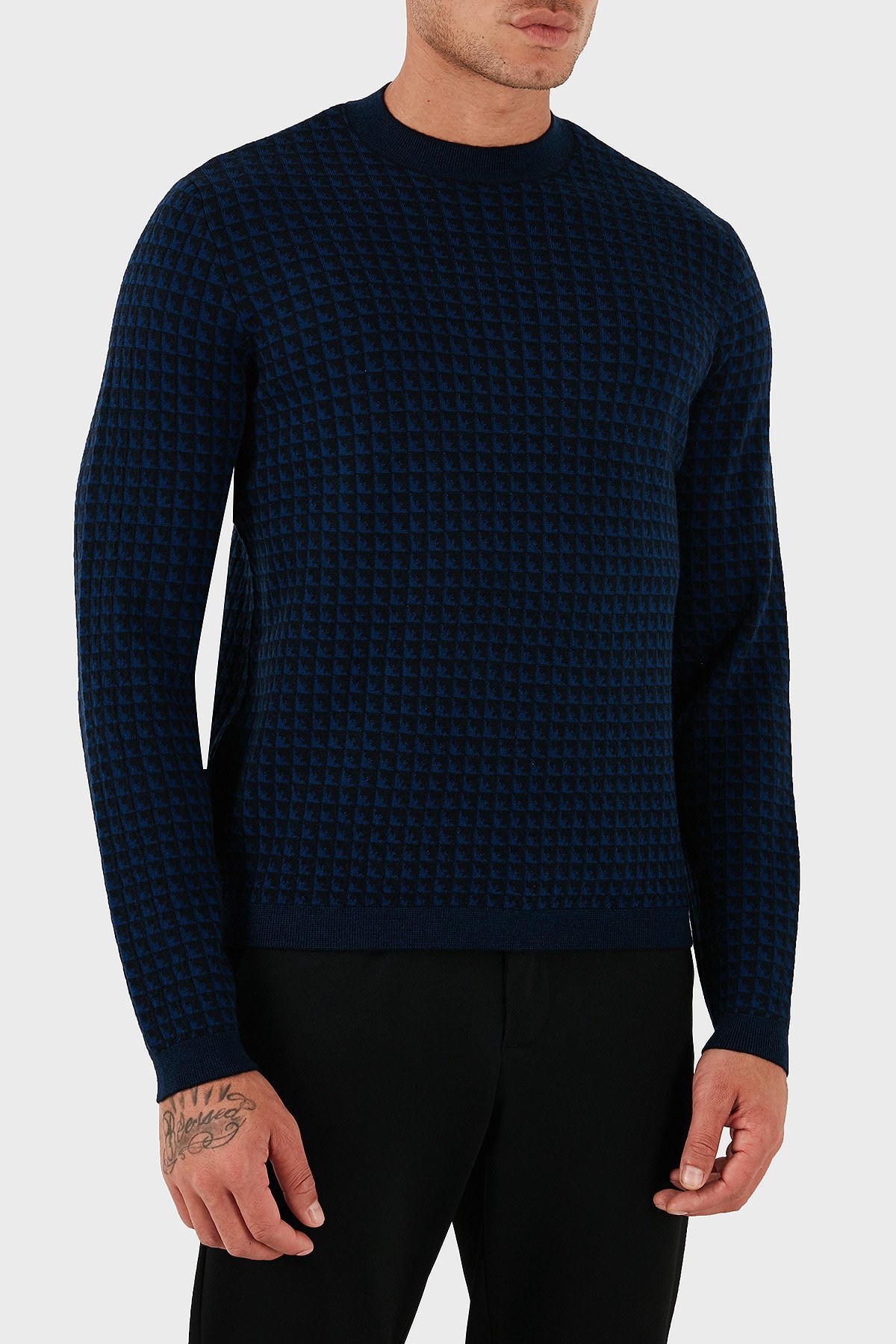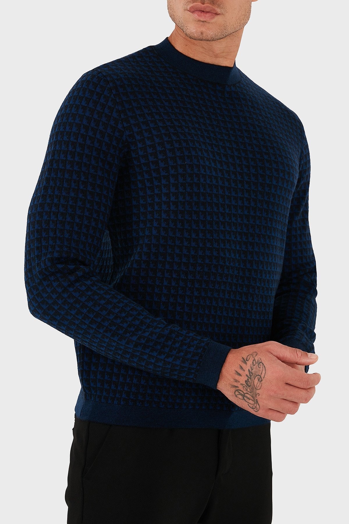Yünlü Jakarlı Logo Basklı Regular Fit Bisiklet Yaka Erkek Kazak EM001989 AF14199 FB066 LACİVERT