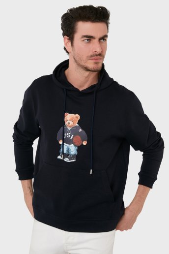 Pamuklu Baskılı Kanguru Cepli Kapüşonlu Erkek Sweat 6141003 LACİVERT
