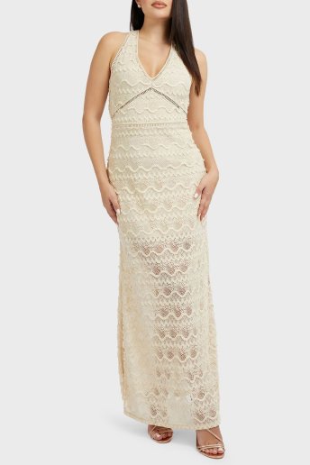 Dar Kesim Sırt Dekolteli V Yaka Yırtmaçlı Güpürlü Maxi Liza Bayan Elbise W3GK27KBPQ0 G1M5 BEJ