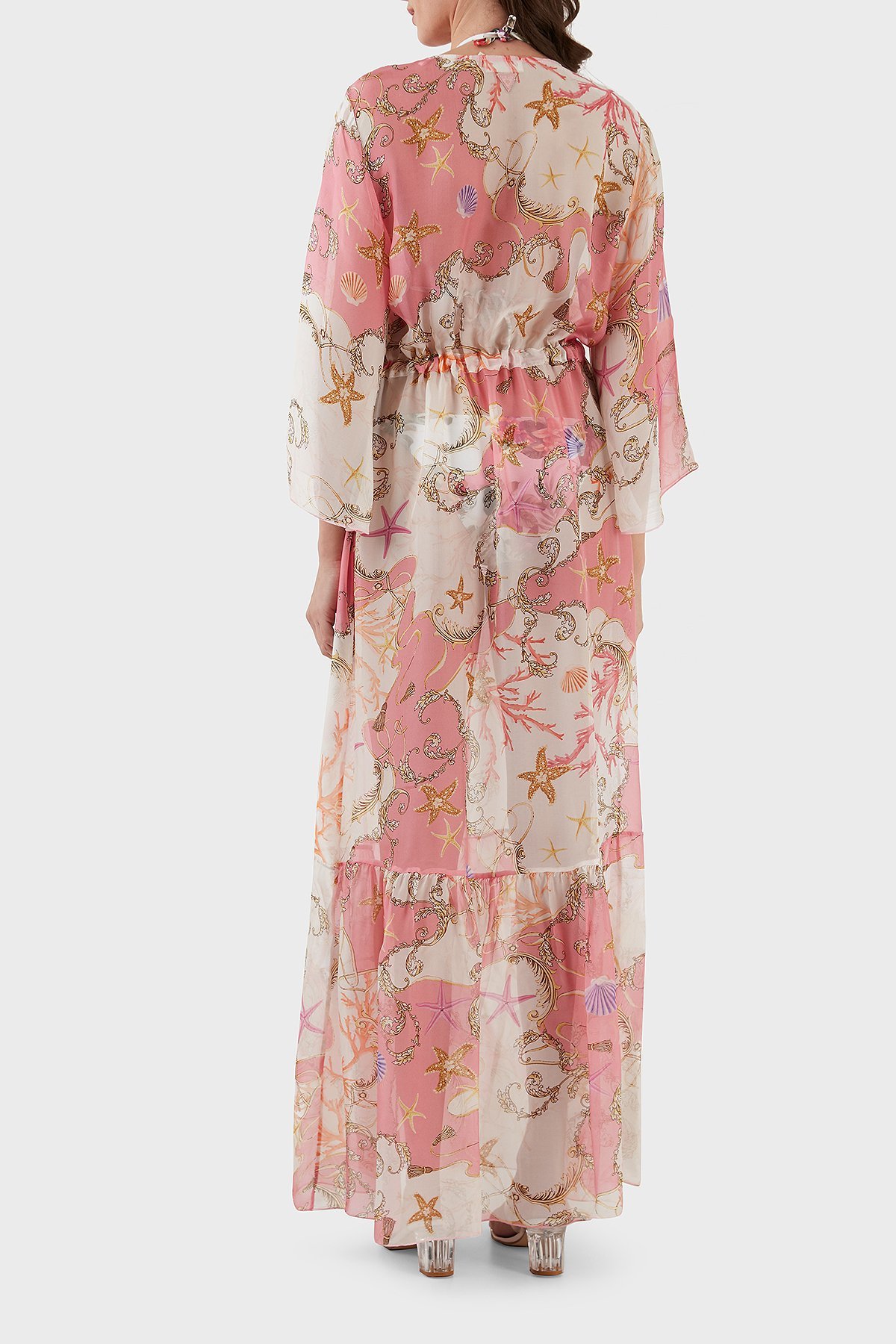 İpek Karışımlı Desenli Bağlama Detaylı Kimono Uzun Bayan Pareo E3GK09WE550 P63W BEYAZ-PEMBE