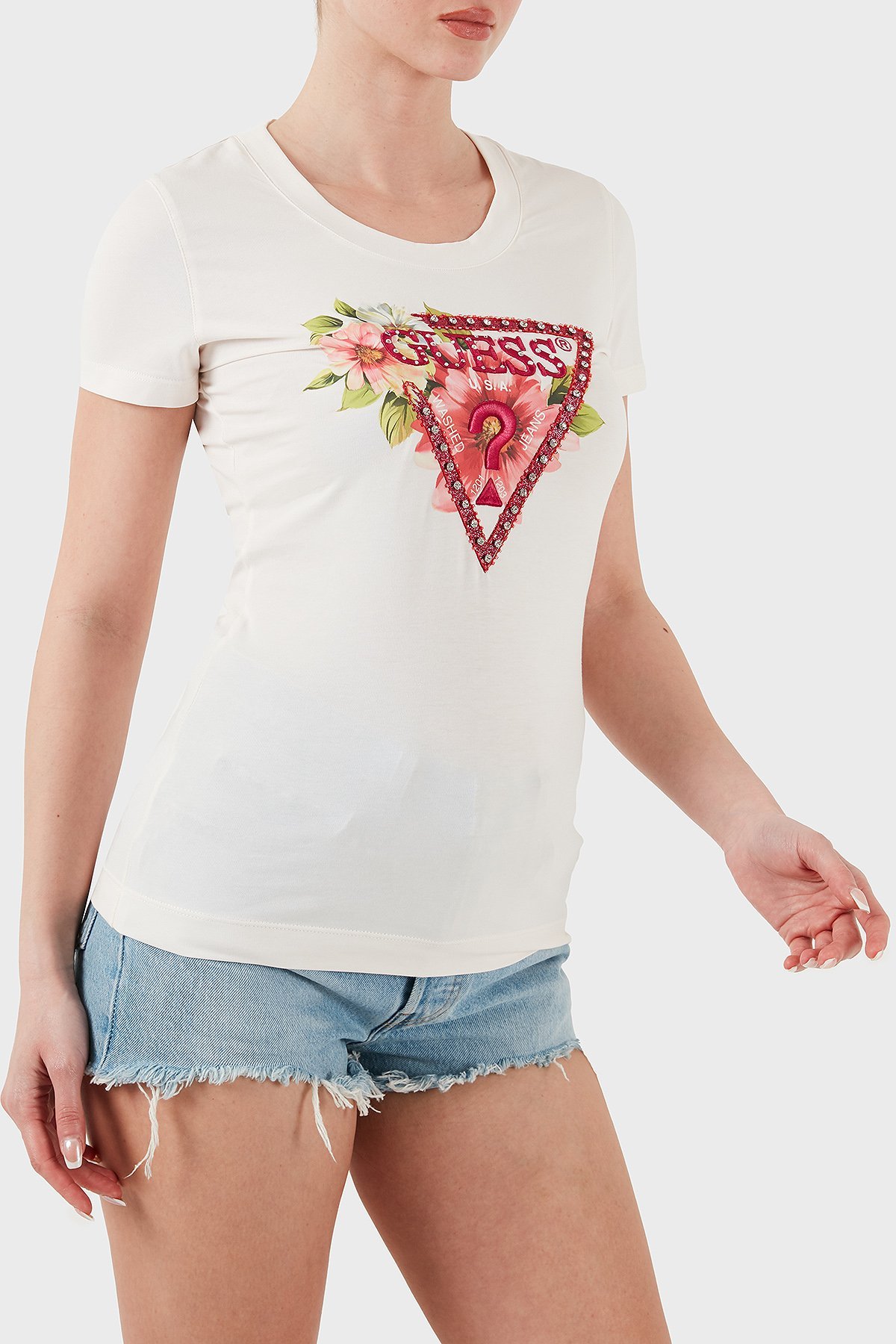 Ss Cn Logo Nakışlı Streç Pamuklu Slim Fit Bisiklet Yaka W5GI10J1314 Bayan T Shirt W5GI10 J1314 G012 EKRU