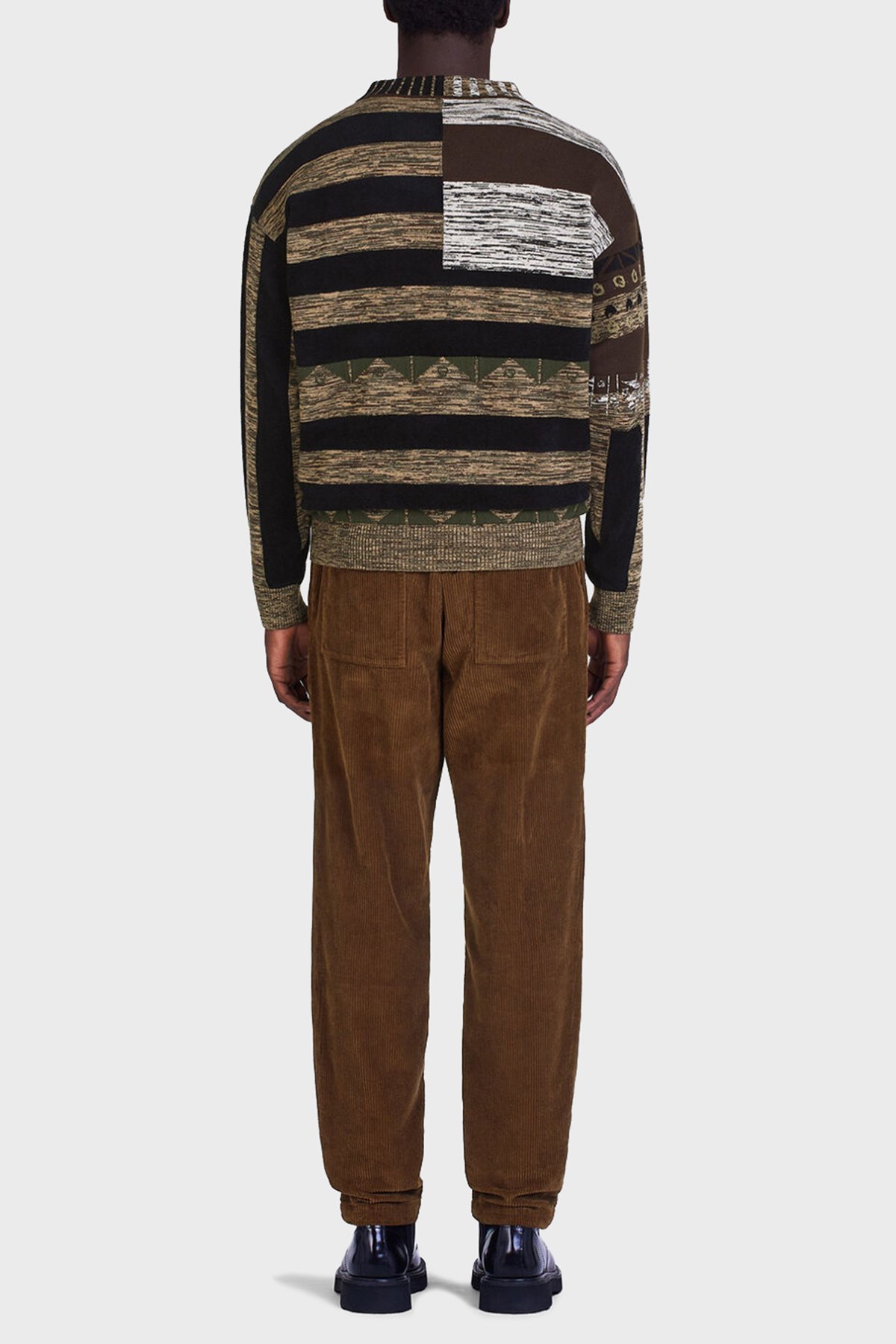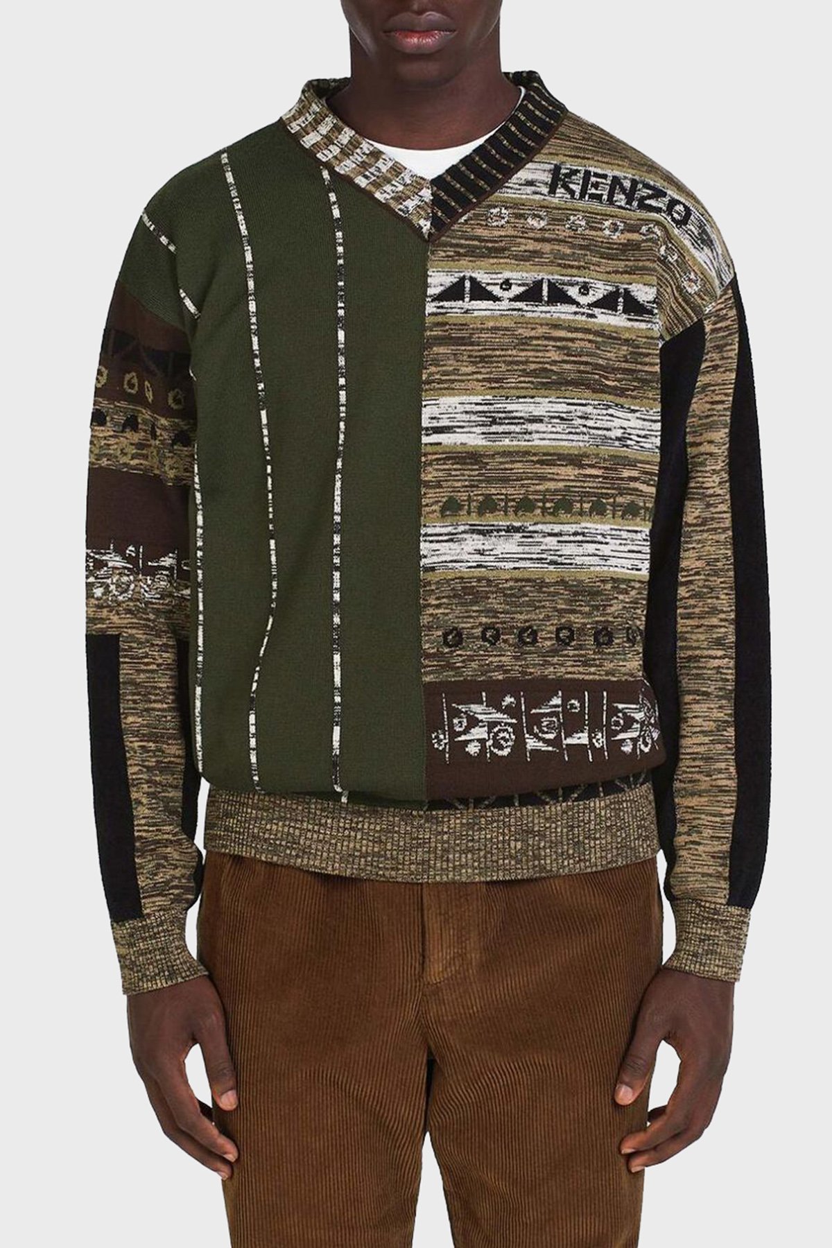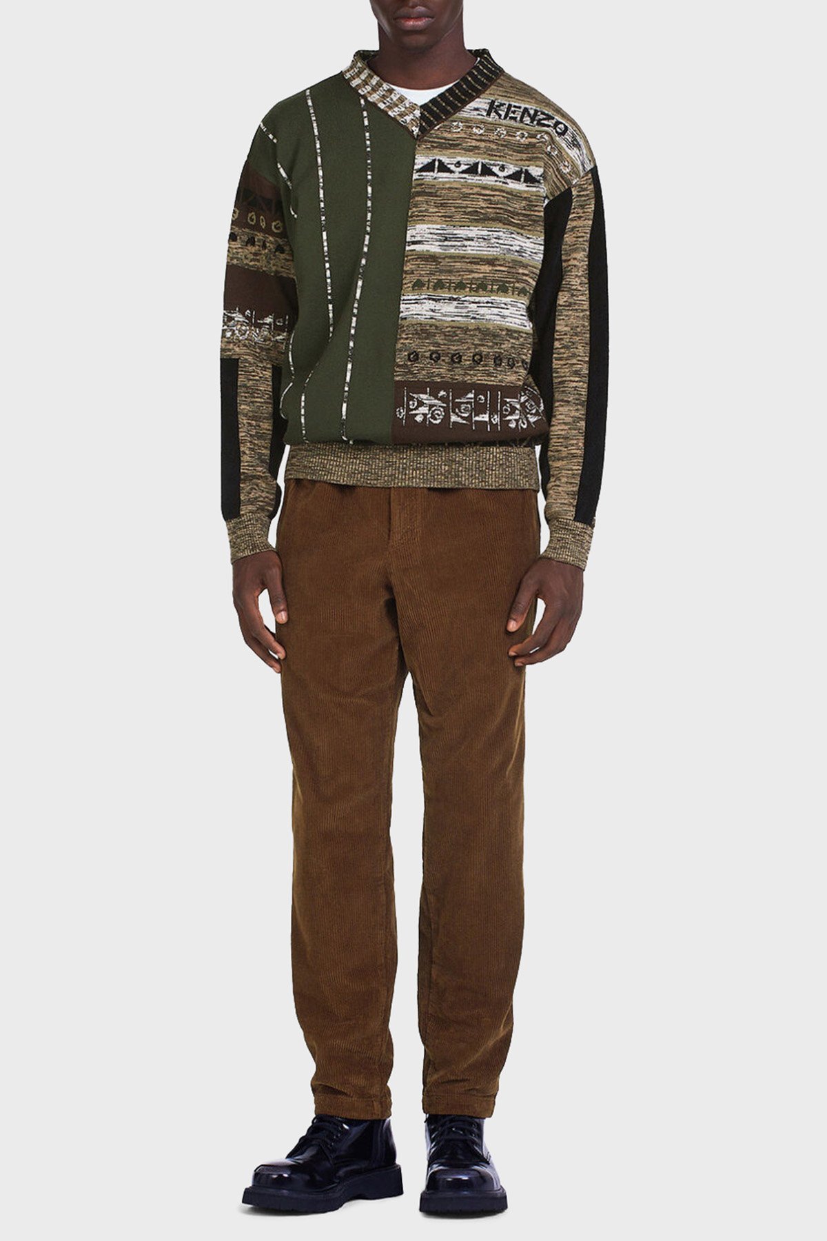 Pamuk ve Yün Karışımlı Desenli Rahat Kesim V Yaka Erkek Kazak FC65PU3193CN51 HAKİ