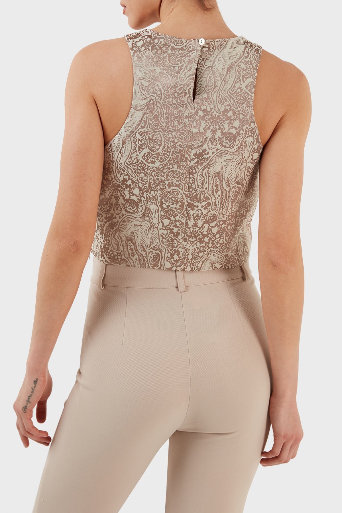Desenli Pamuklu Bisiklet Yaka Cropped Bayan T Shirt LB23SSHOEFUTO-006 KAHVE