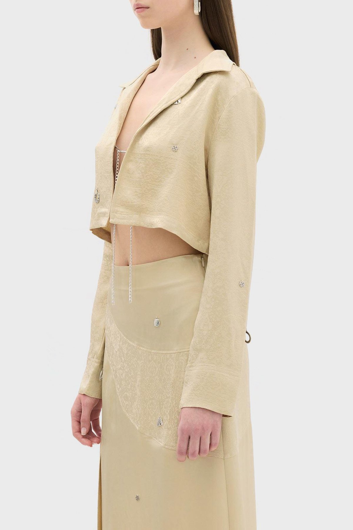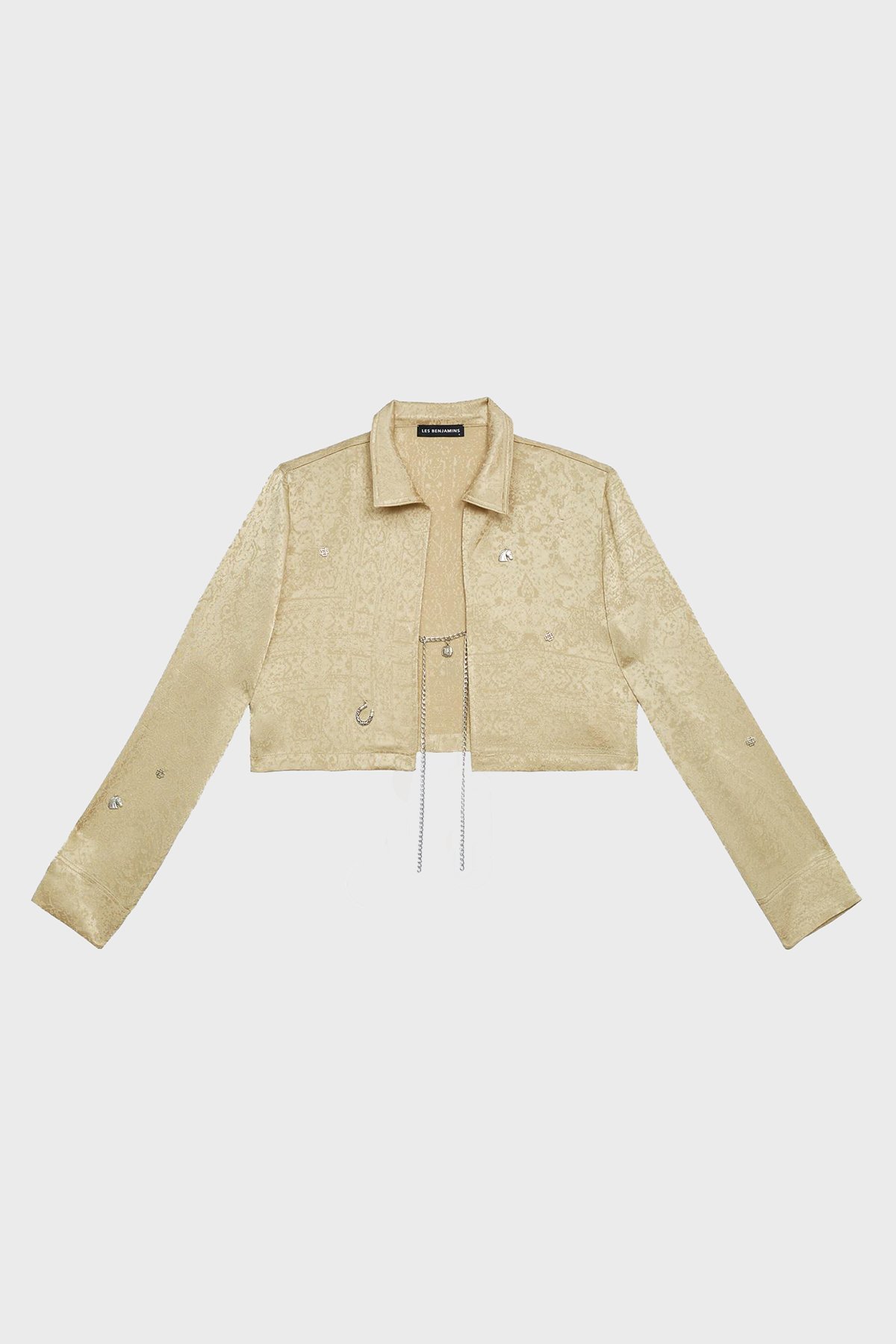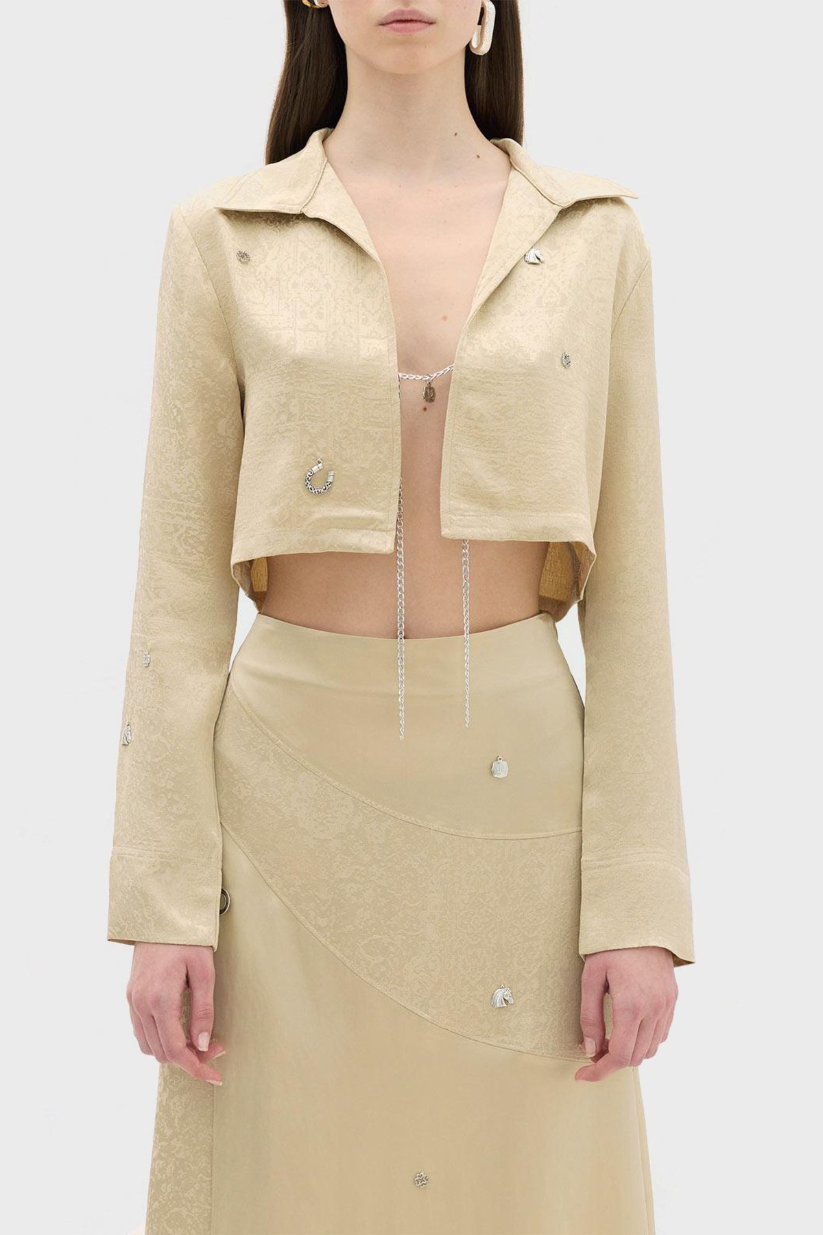 Jakarlı Zincir Detaylı Rahat Kesim Crop Bayan Gömlek Ceket LB23SSHOEFUSH-101 BEJ