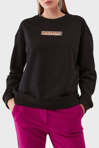 % 100 Pamuk Parlak Taş Logolu Bisiklet Yaka Regular Fit Bayan Sweat 101607 A12I Z99 SİYAH