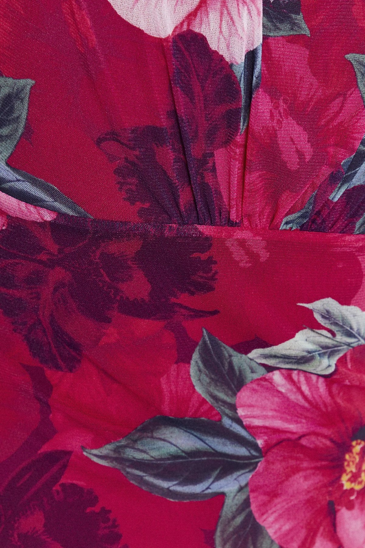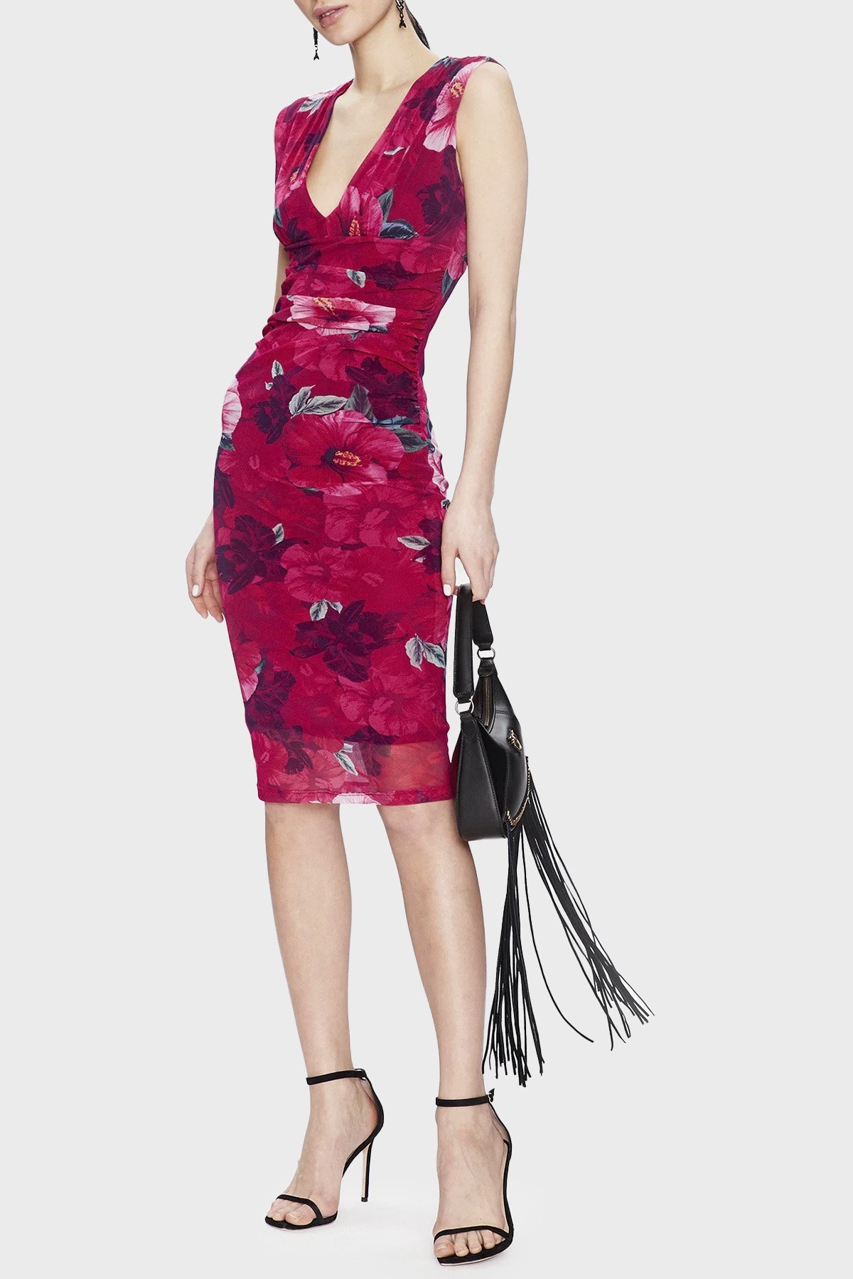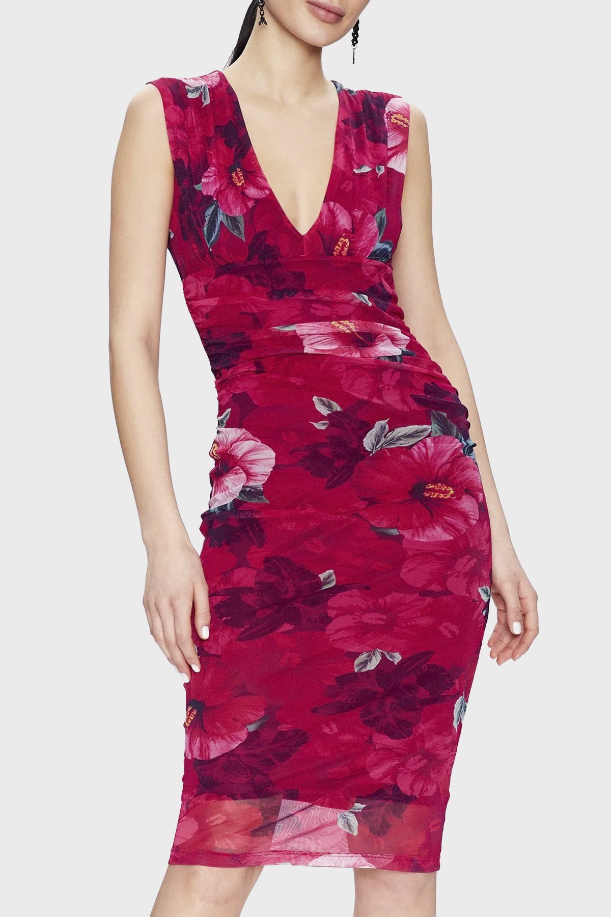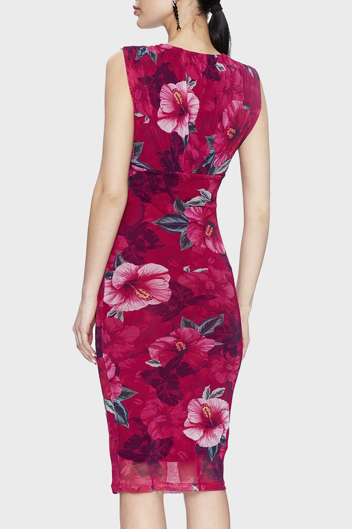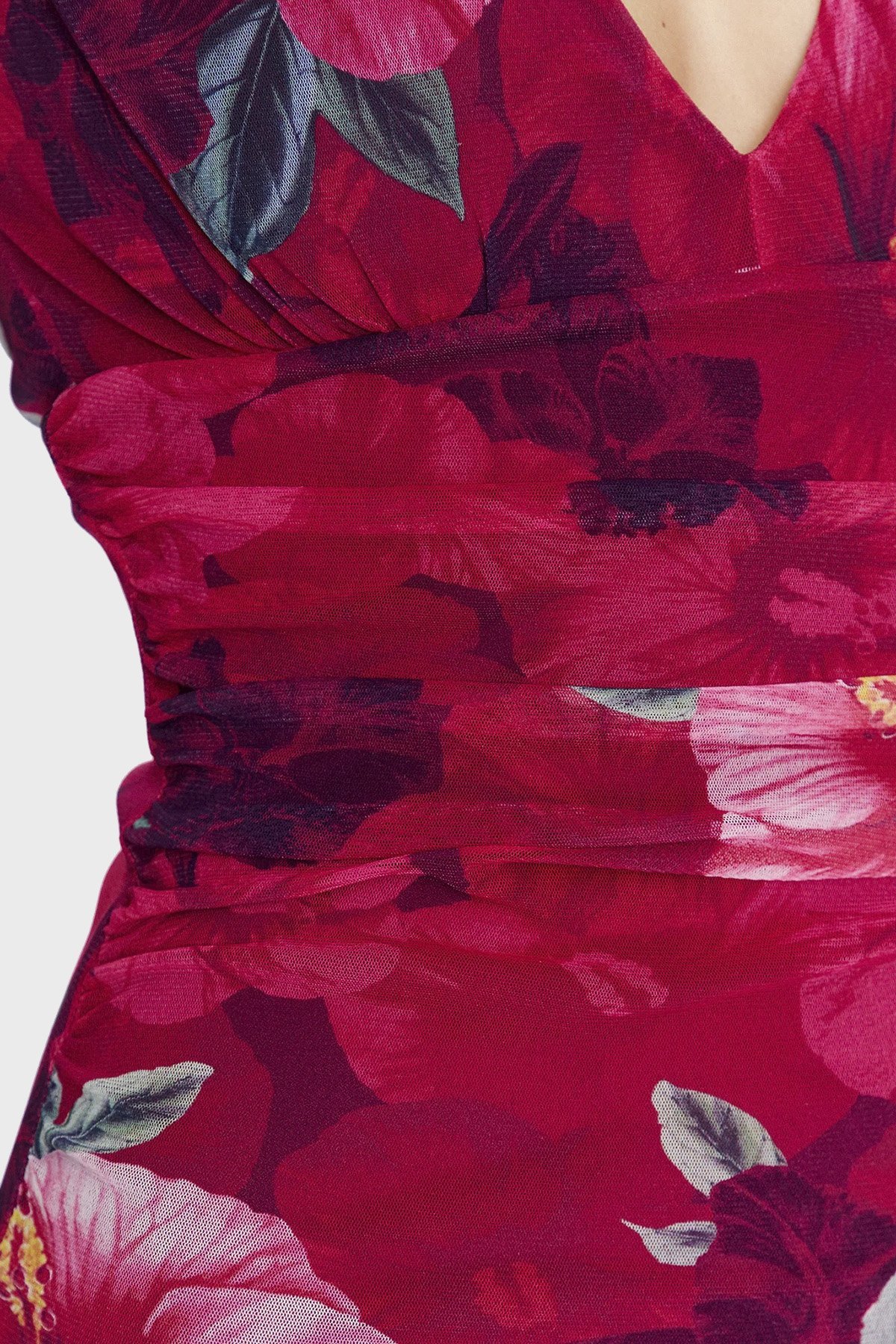 Çiçek Desenli Drapeli V Yaka Dar Kesim Bayan Elbise 101025 A0PK YN3 FUŞYA