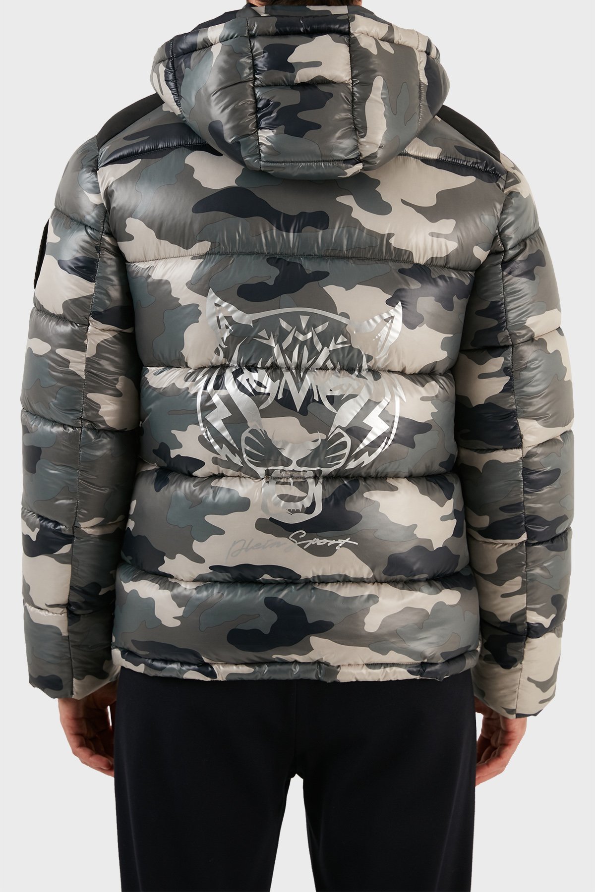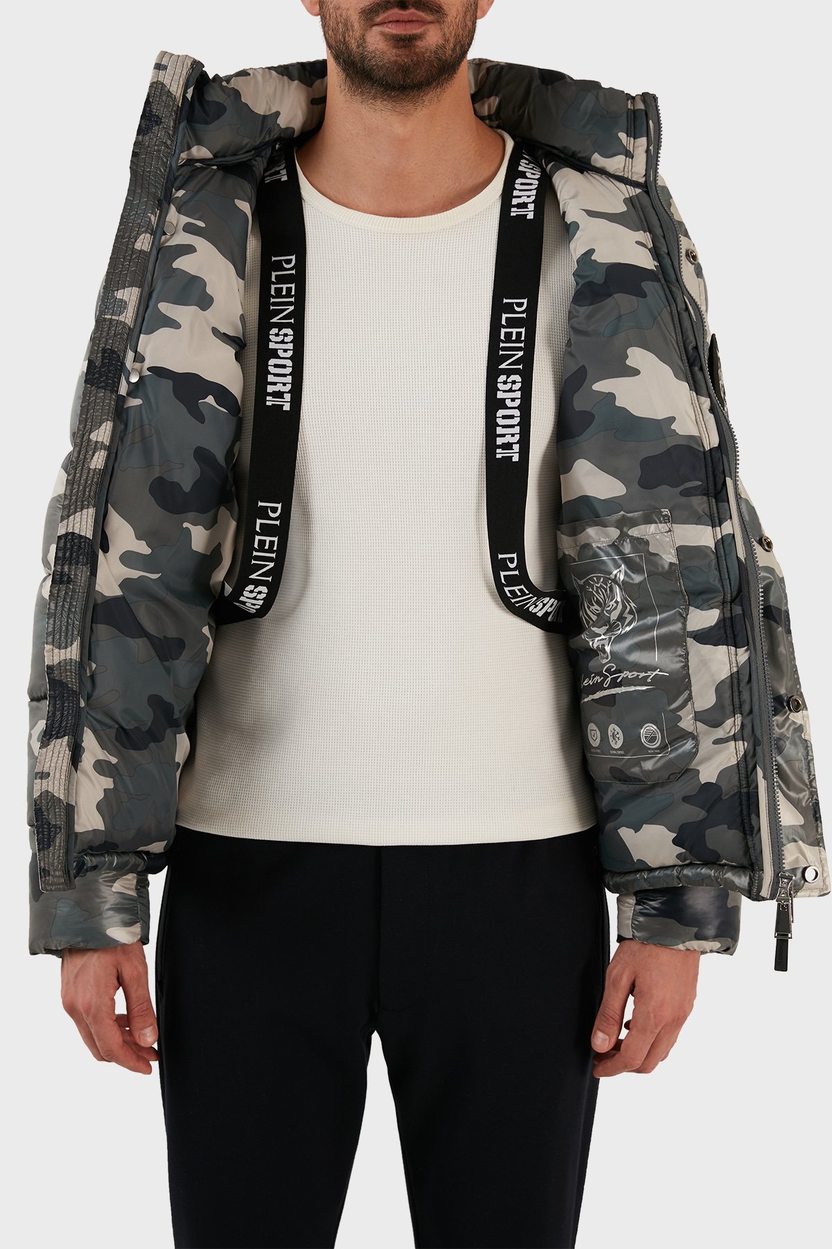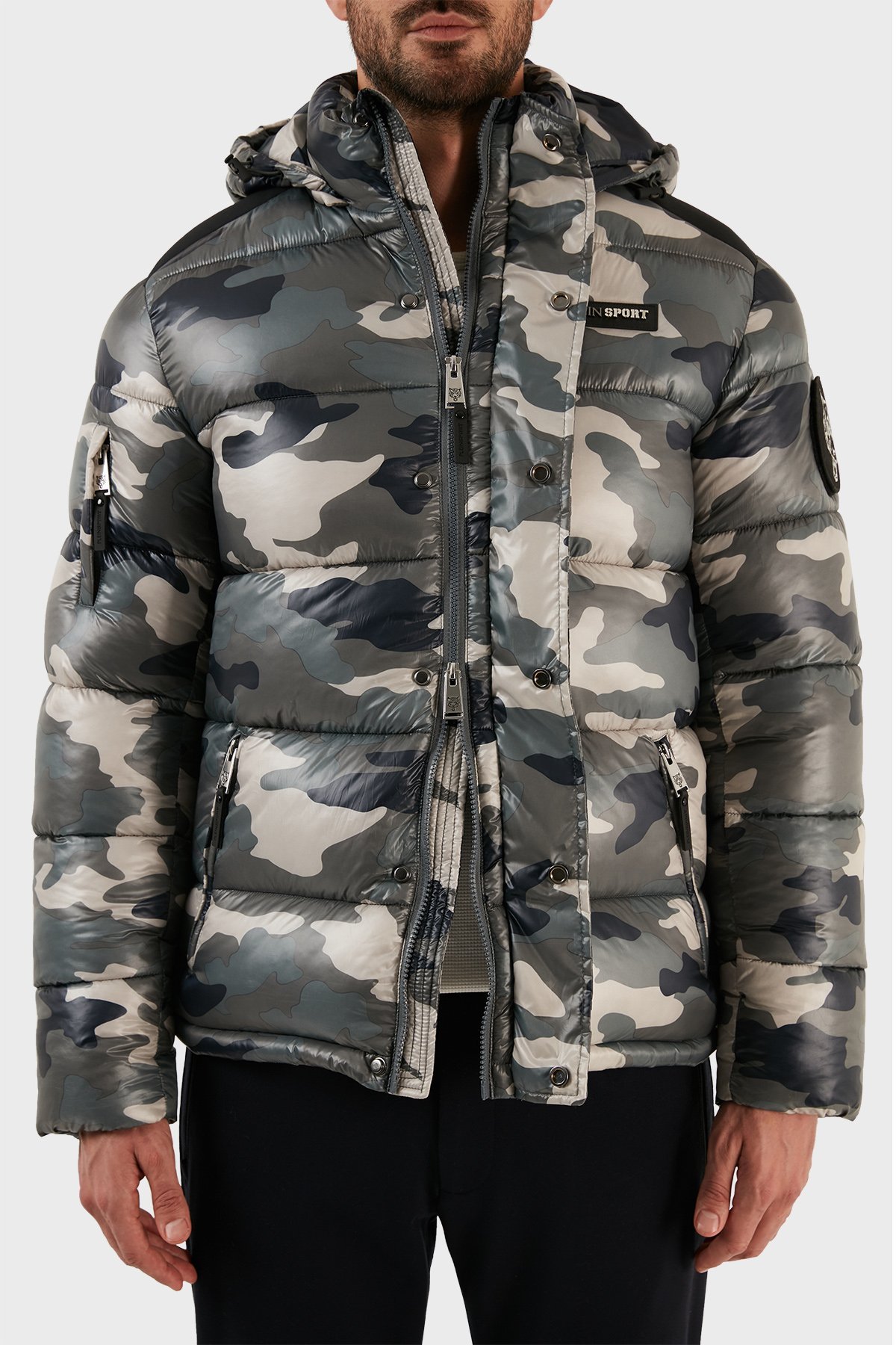 Logolu Kamuflaj Desenli Yalıtımlı Çıkarılabilir Kapüşonlu Erkek Mont UPPS10232 HAKİ