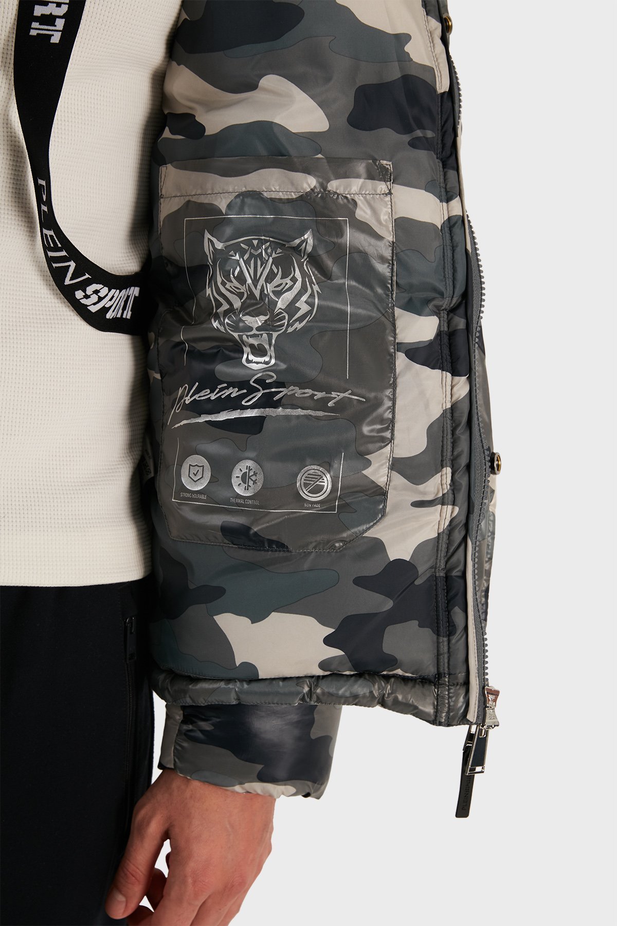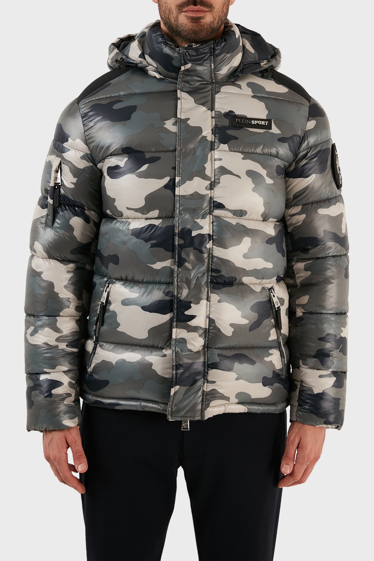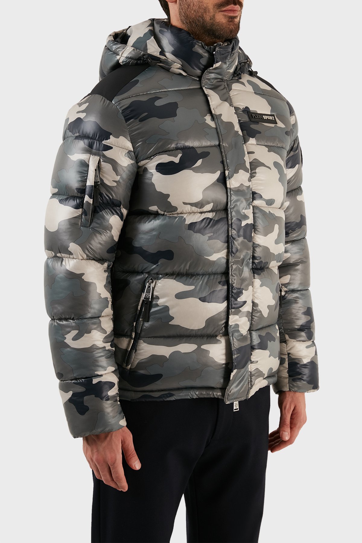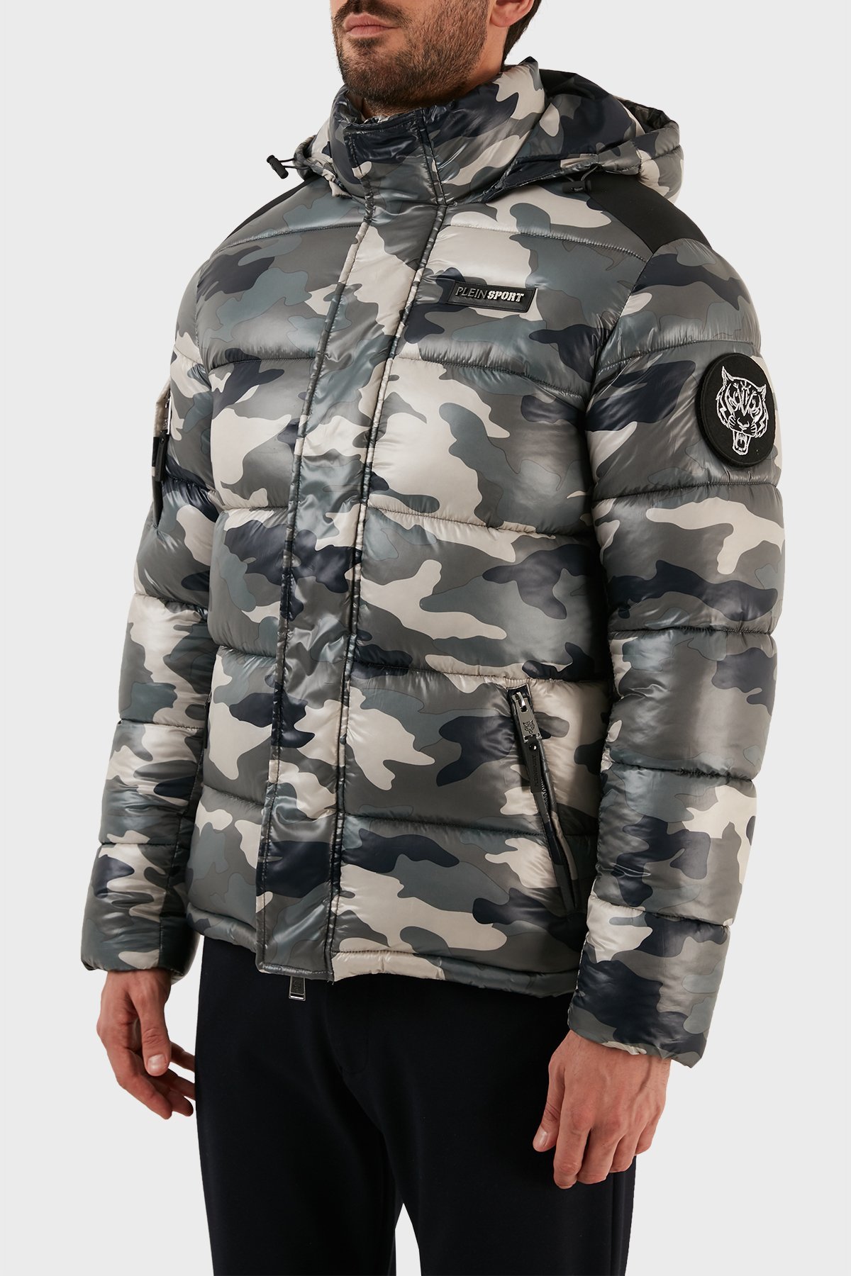 Logolu Kamuflaj Desenli Yalıtımlı Çıkarılabilir Kapüşonlu Erkek Mont UPPS10232 HAKİ