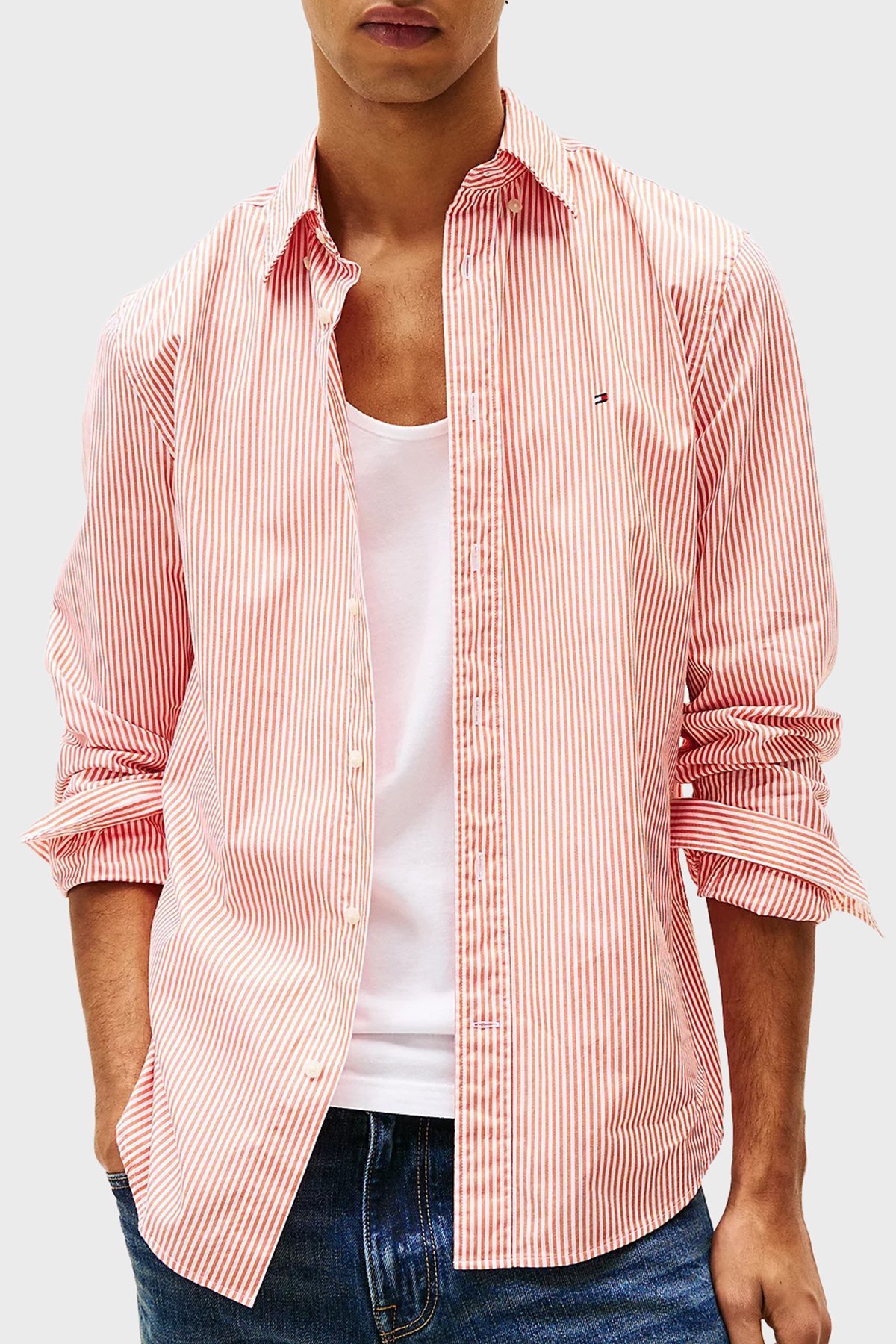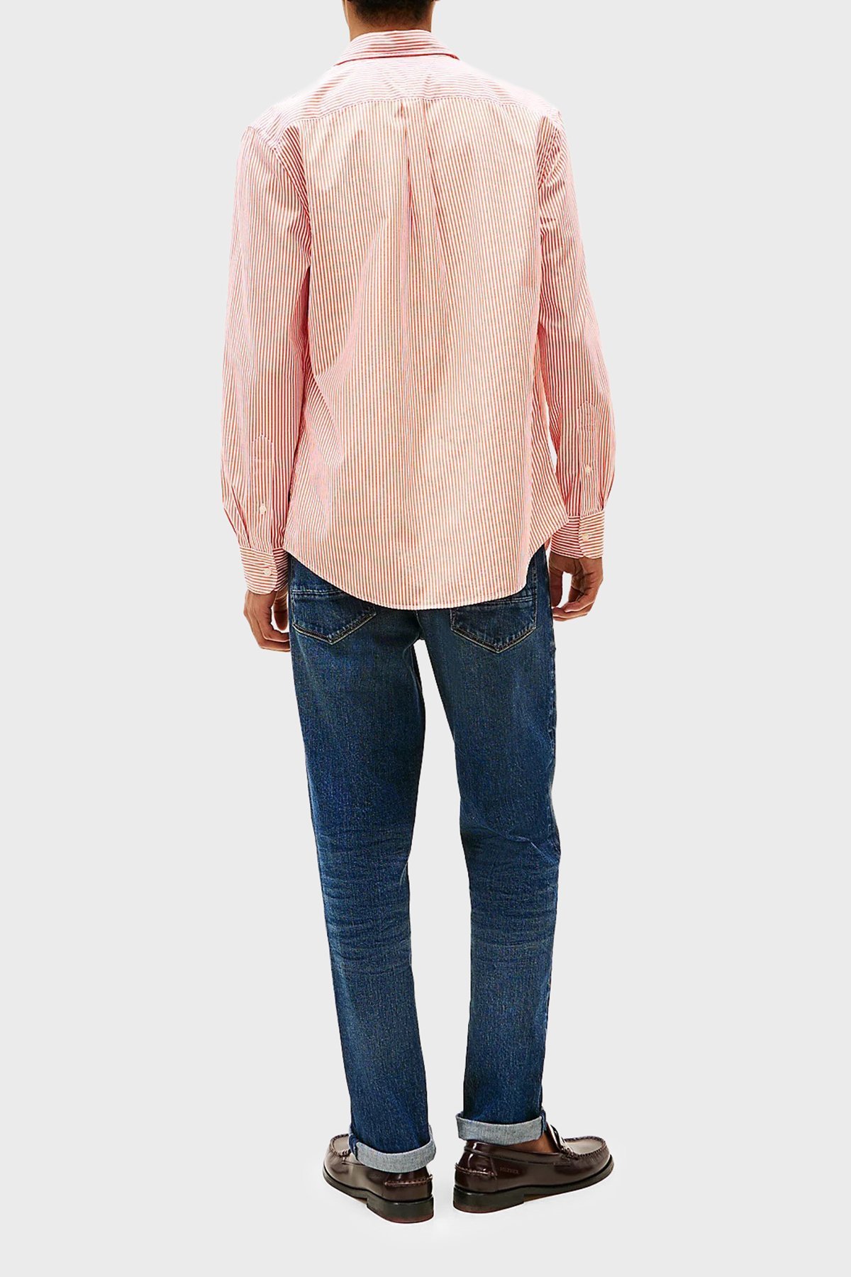 % 100 Pamuk Regular Fit Çizgili Düğmeli Yaka Erkek Gömlek MW0MW37549 0DM Orange-Beyaz
