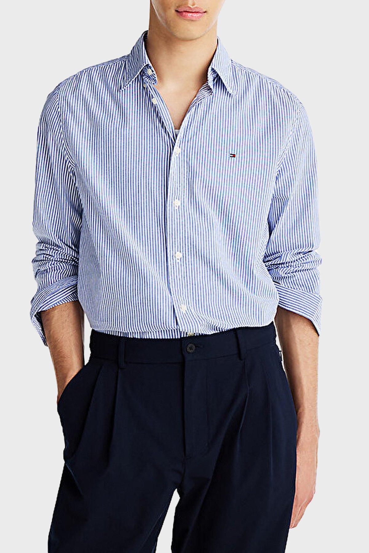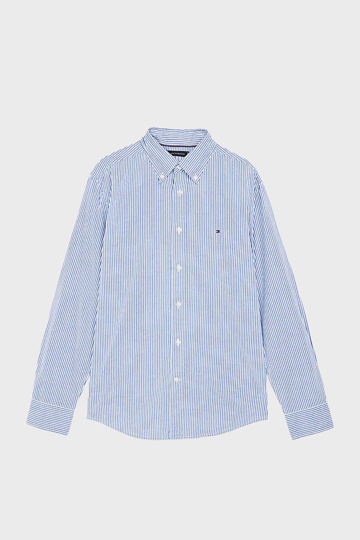 % 100 Pamuk Regular Fit Düğmeli Yaka Çizgili Erkek Gömlek MW0MW37549 0A5 MAVİ-BEYAZ
