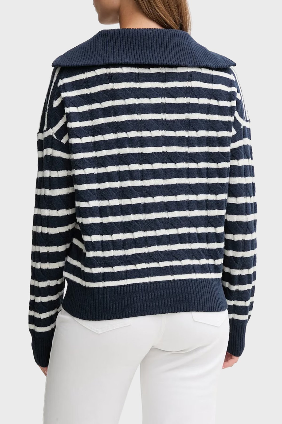 % 100 Yün Relaxed Fit Yarım Fermuarlı Dik Yaka Örgü Bayan Kazak WW0WW46425 0Y7 LACİVERT-BEYAZ