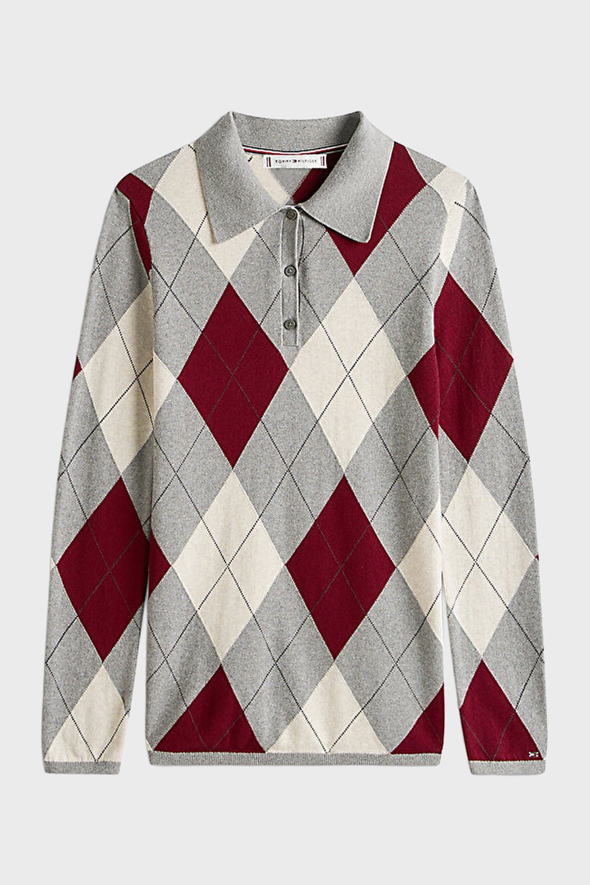 Baklava Desenli Pamuklu Regular Fit Bayan Polo Yaka Kazak WW0WW48393 0K1 GRİ-BORDO