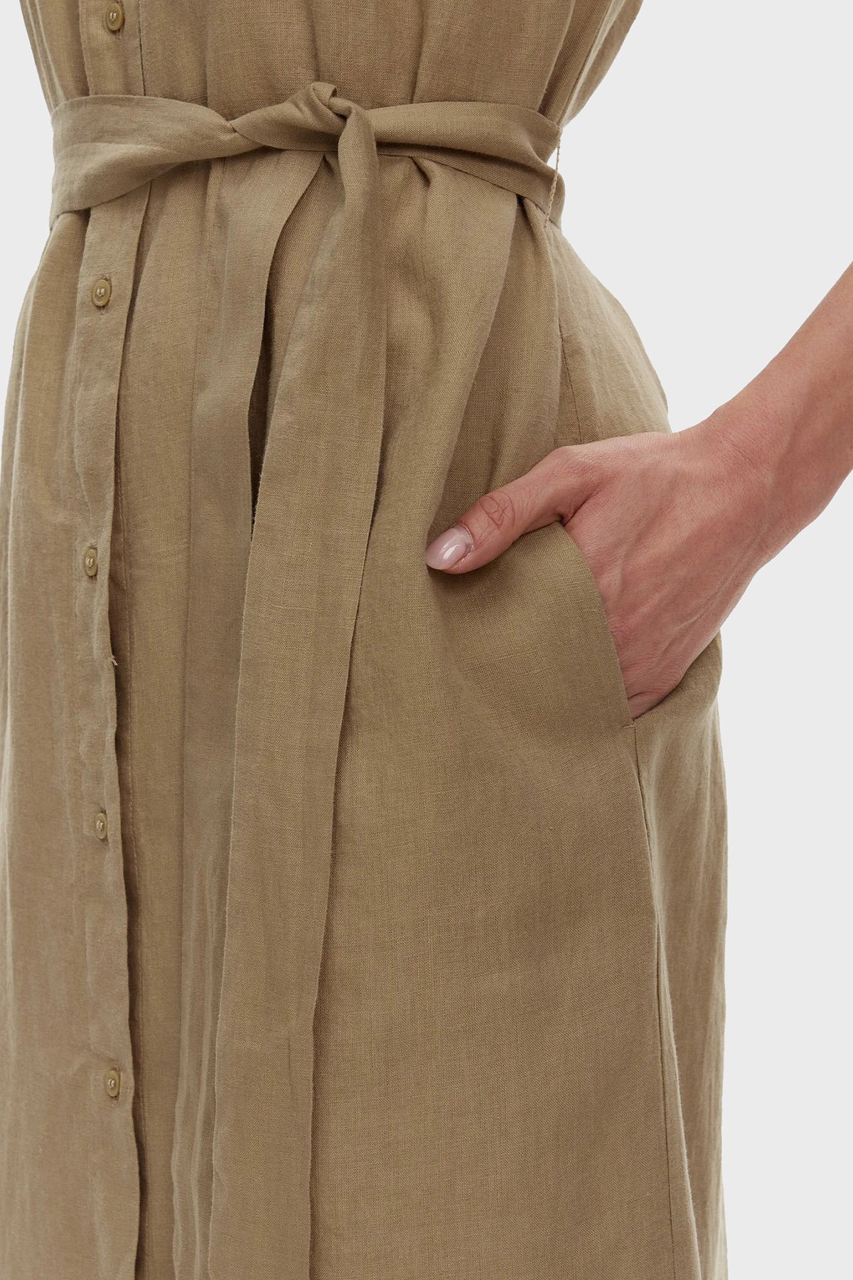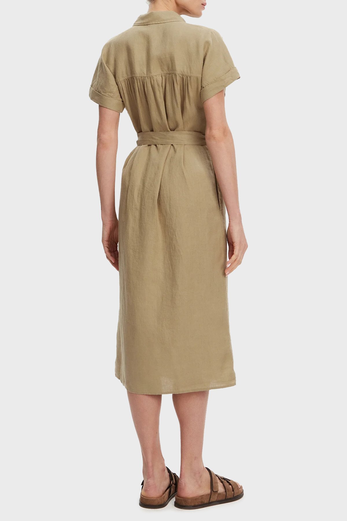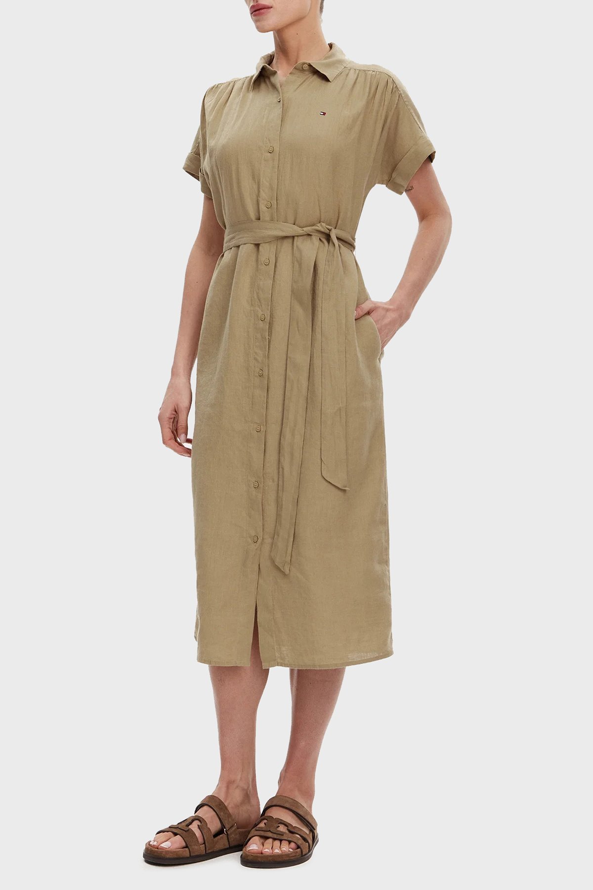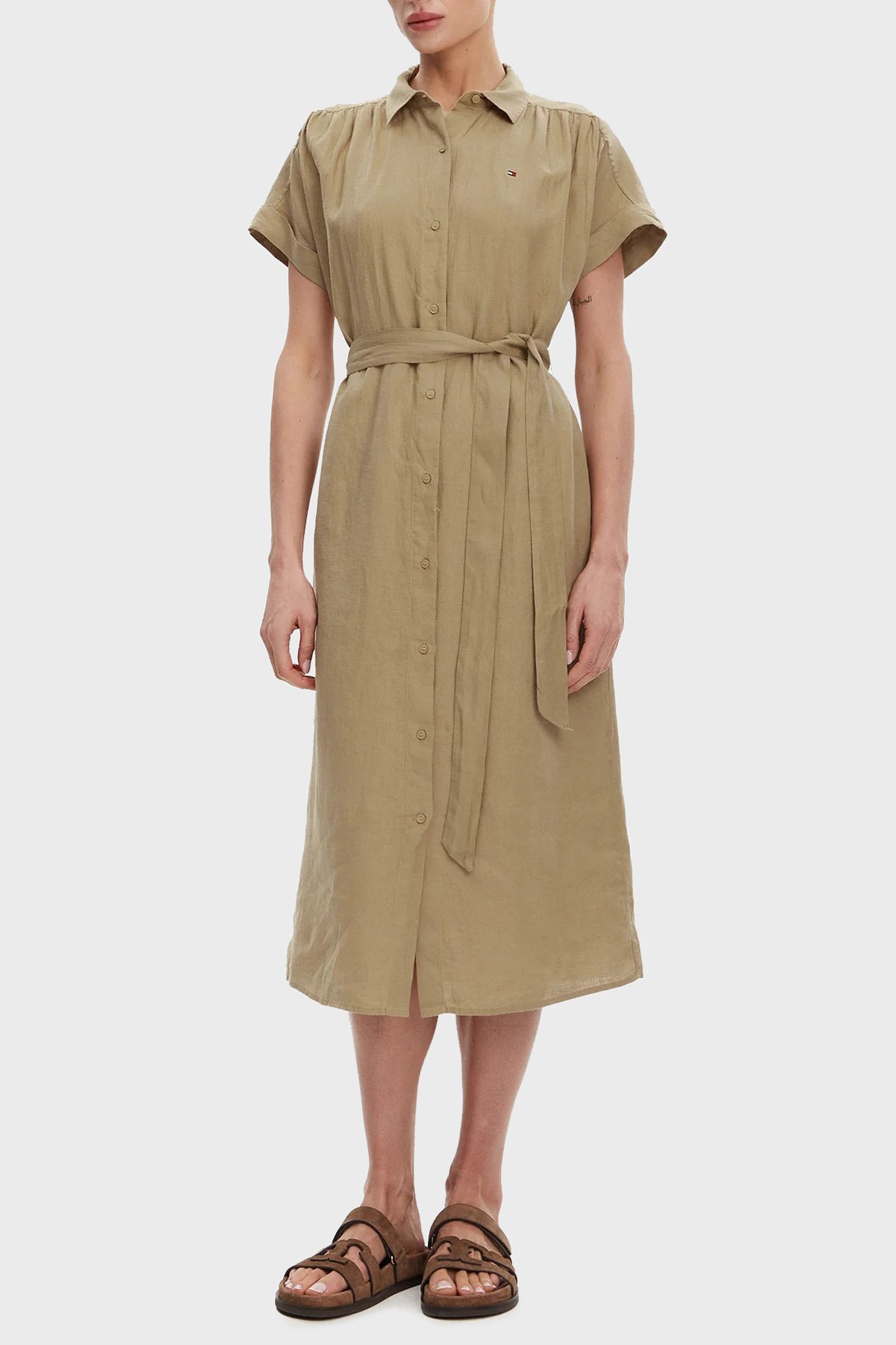 Logolu % 100 Keten Regular Fit Kemerli Bayan Gömlek Elbise WW0WW44653 AEH CAMEL