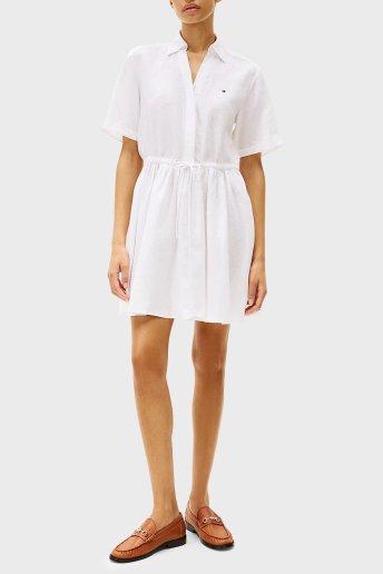 Logolu % 100 Keten Regular Fit Mini Boy Bayan Gömlek Elbise WW0WW44672 YCF BEYAZ