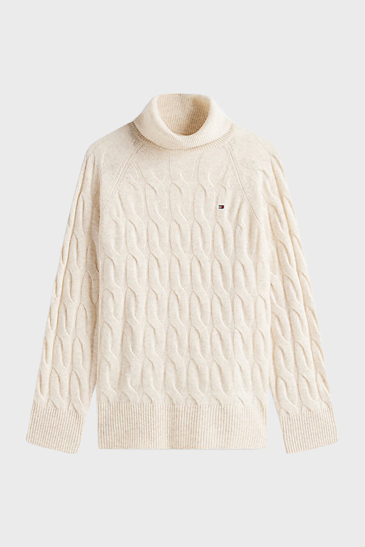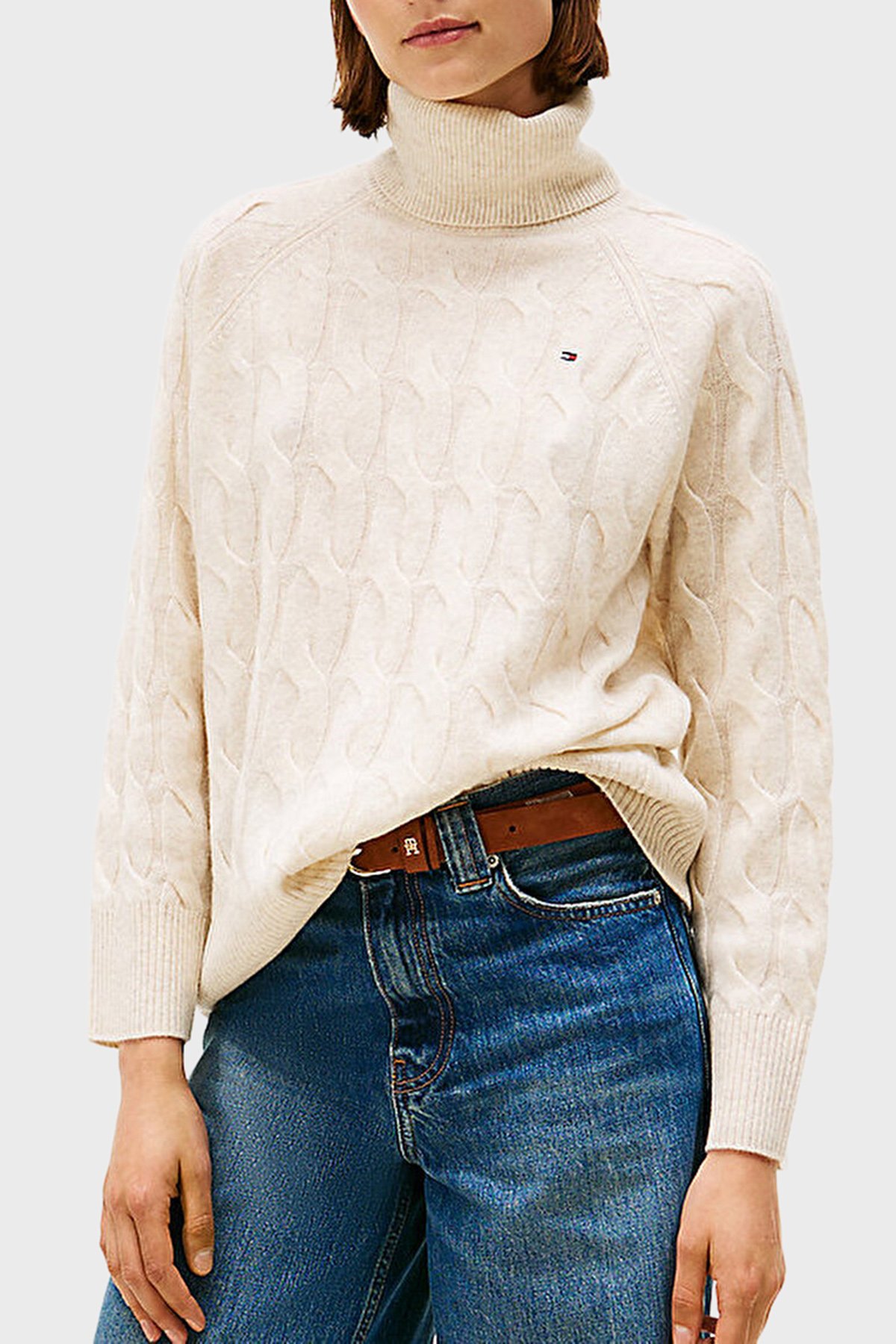 Örgülü Yünlü Relaxed Fit Balıkçı Yaka Bayan Kazak WW0WW46791 ADK BEJ