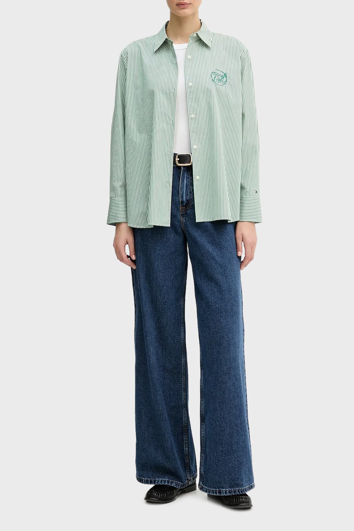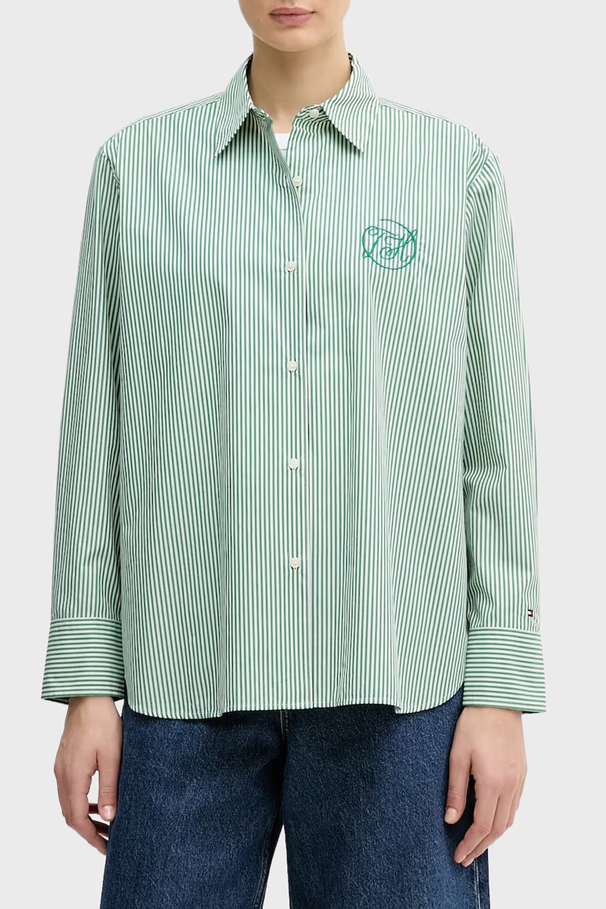 Pamuklu Regular Fit Çizgili Uzun Kollu Bayan Gömlek WW0WW48190 0CD YEŞİL