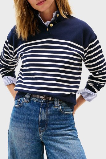 Şeritli Pamuklu Regular Fit Düğmeli Balıkçı Yaka Bayan Kazak WW0WW47467 0FI LACİVERT-BEYAZ
