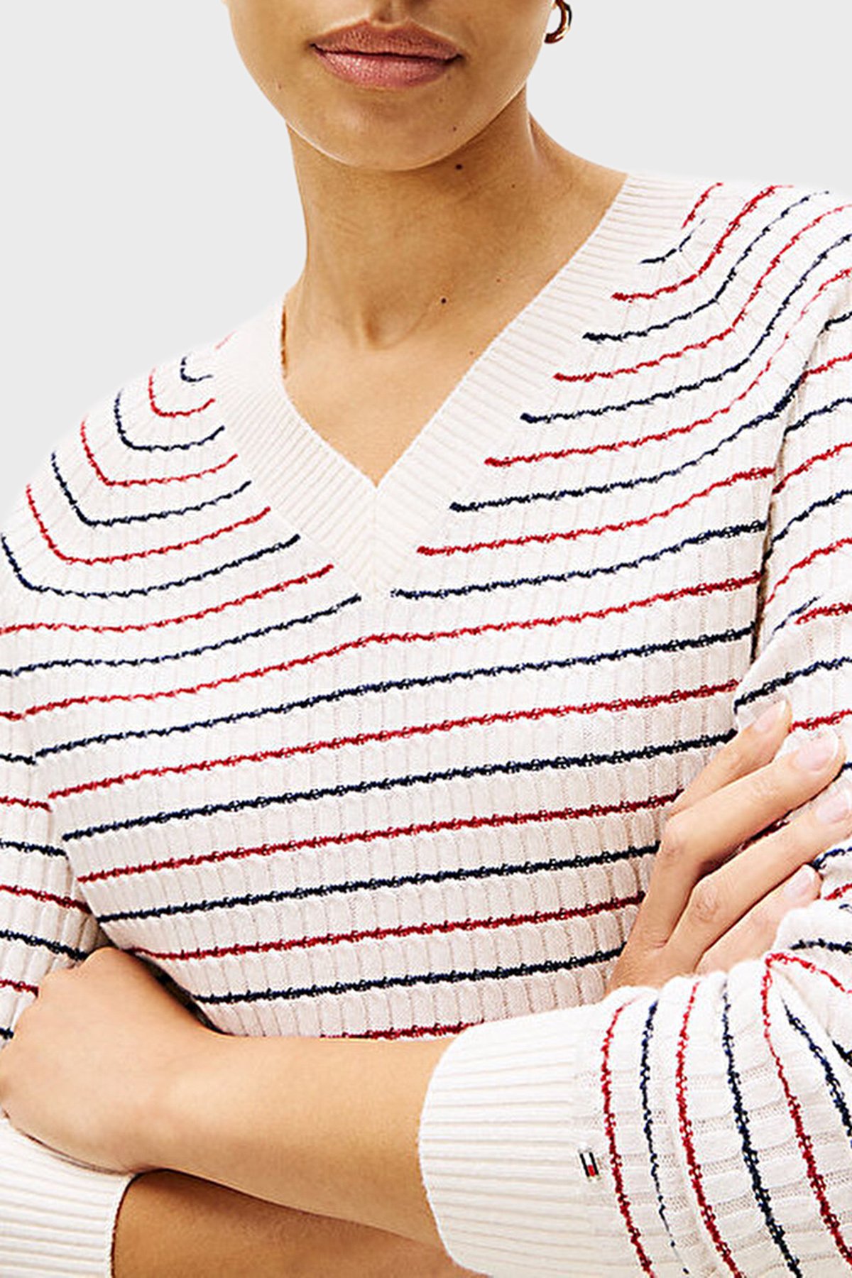 Yün ve Kaşmir Karışımlı Relaxed Fit V Yaka Bayan Kazak WW0WW46417 0FH BEYAZ-LACİVERT