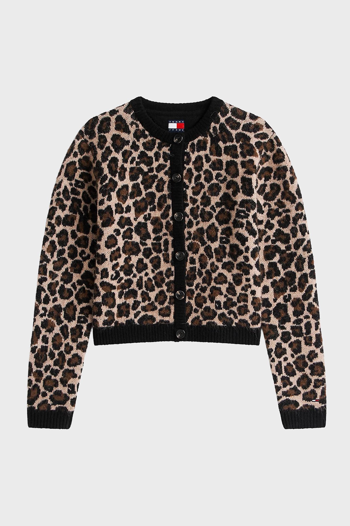 Yün Karışımlı Leopar Desenli Relaxed Fit Bisiklet Yaka Bayan Hırka DW0DW21968 0HD KAHVE