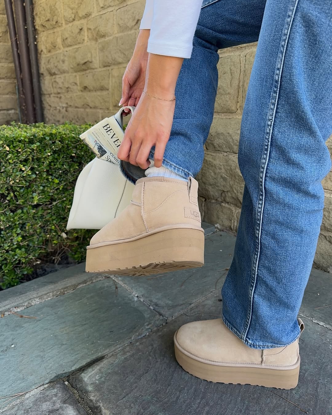 Mom jean pantolonlar yanı sıra ugg ile birlikte bootcut jean pantolonlar kullanılabiliyor. Bootcut pantolonlar dar kesim bel yapısına ek olarak dizden aşağıya doğru bollaşan yapısıyla dikkat çekiyor. Bu pantolonlar resmi görüntü için tercih edilebiliyor. Bu pantolonlarla resmi görünüm kazanmak ise kombin için ugg platform bot kullanılmasıyla mümkün oluyor.