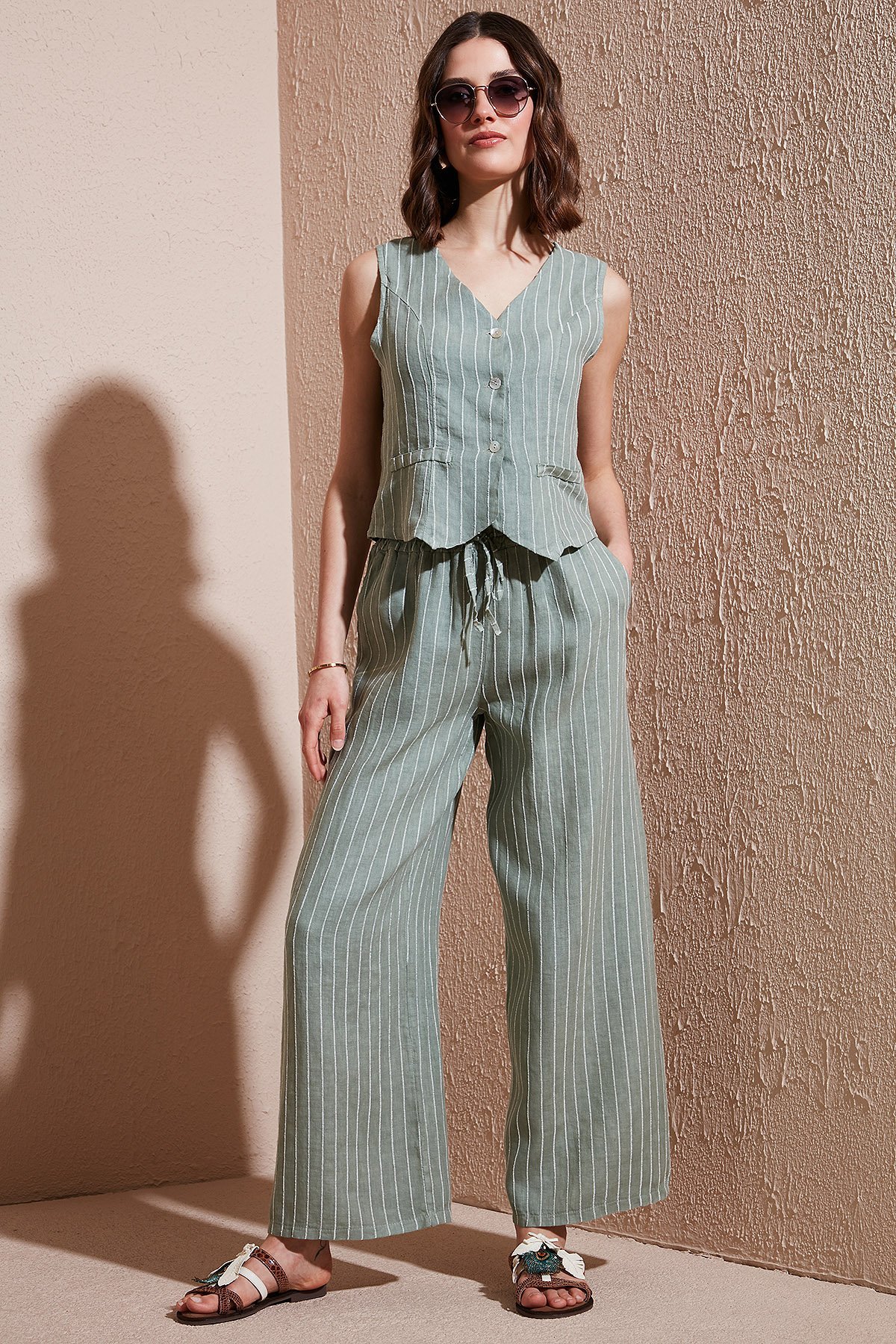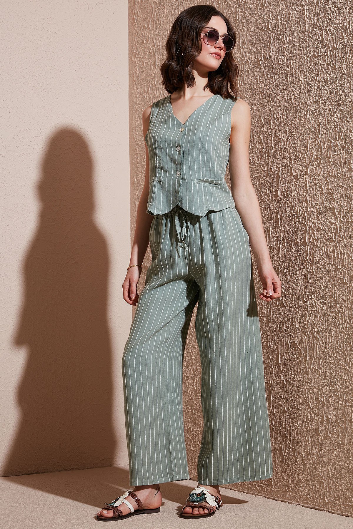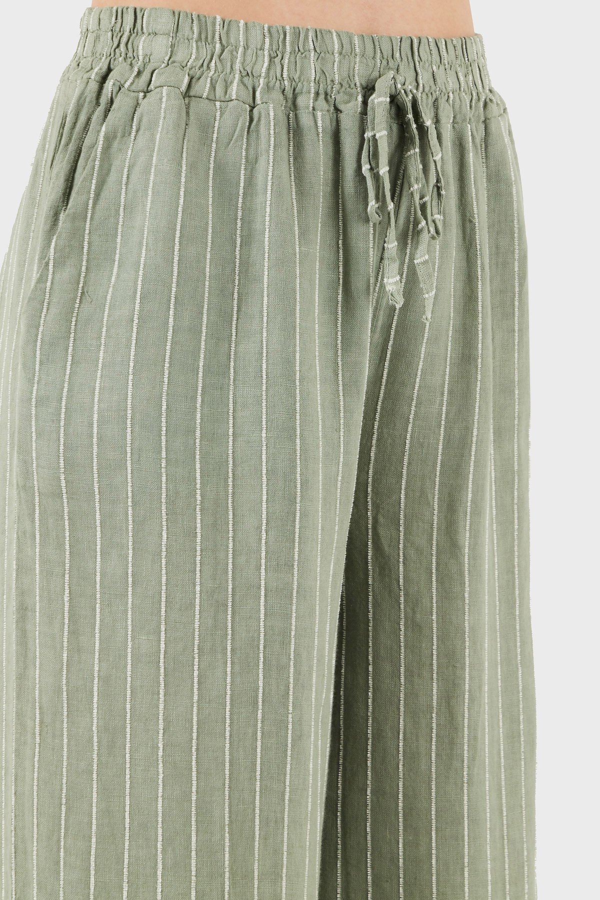 Çizgili Regular Fit Normal Bel Geniş Paça Keten Bayan Pantolon 4998OS544 HAKİ