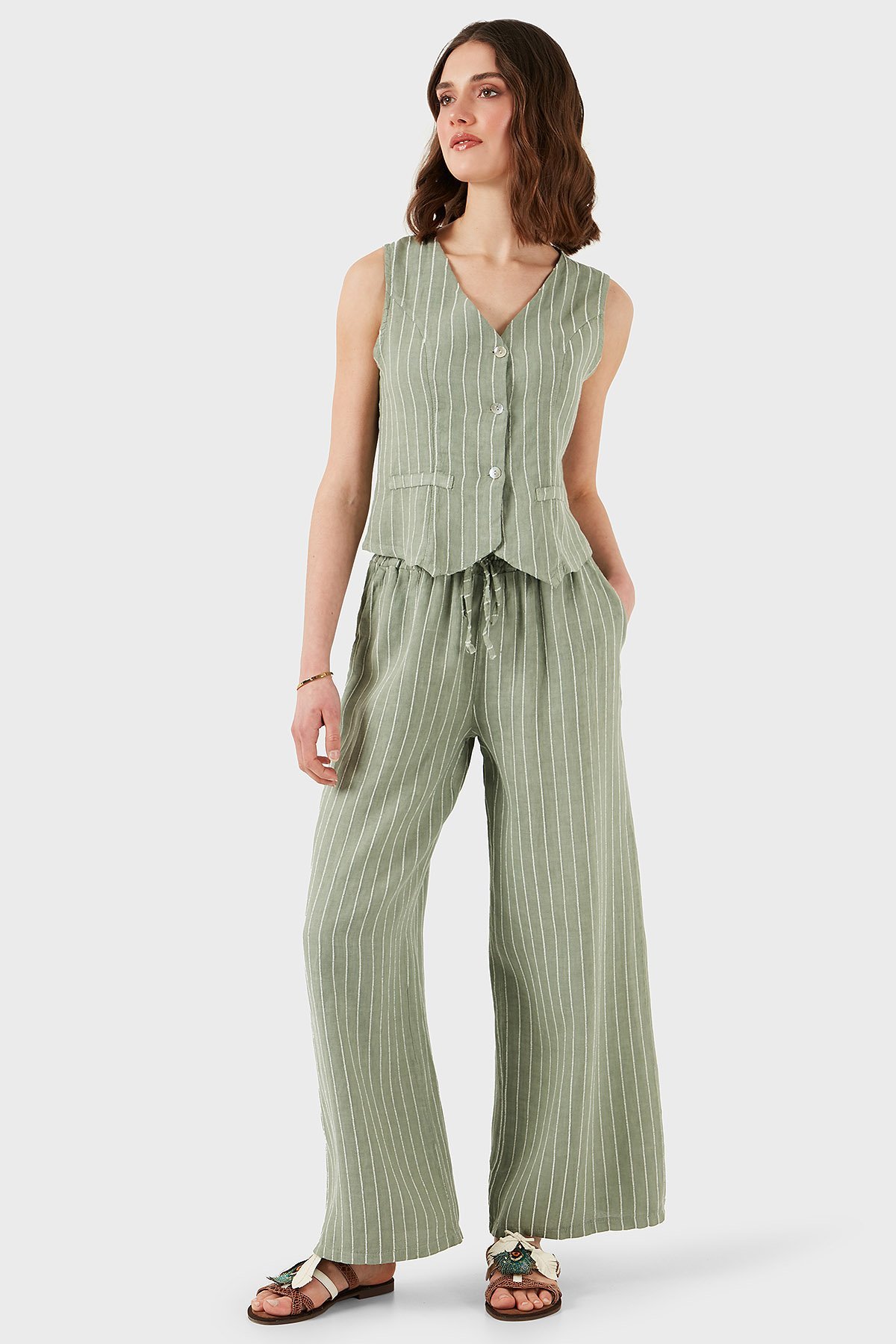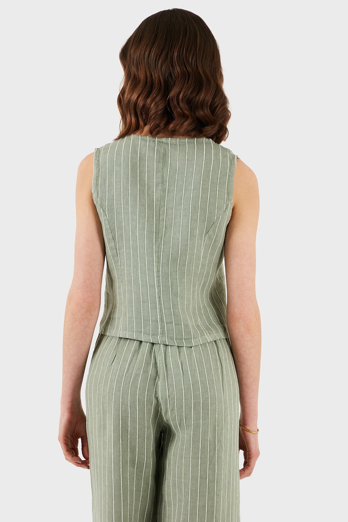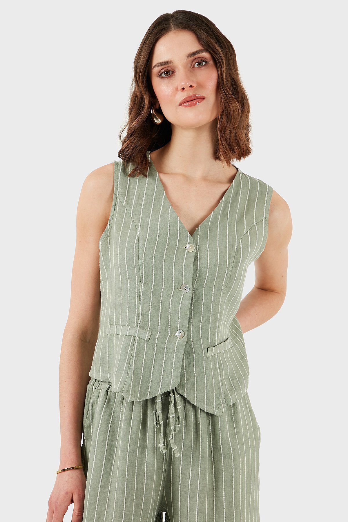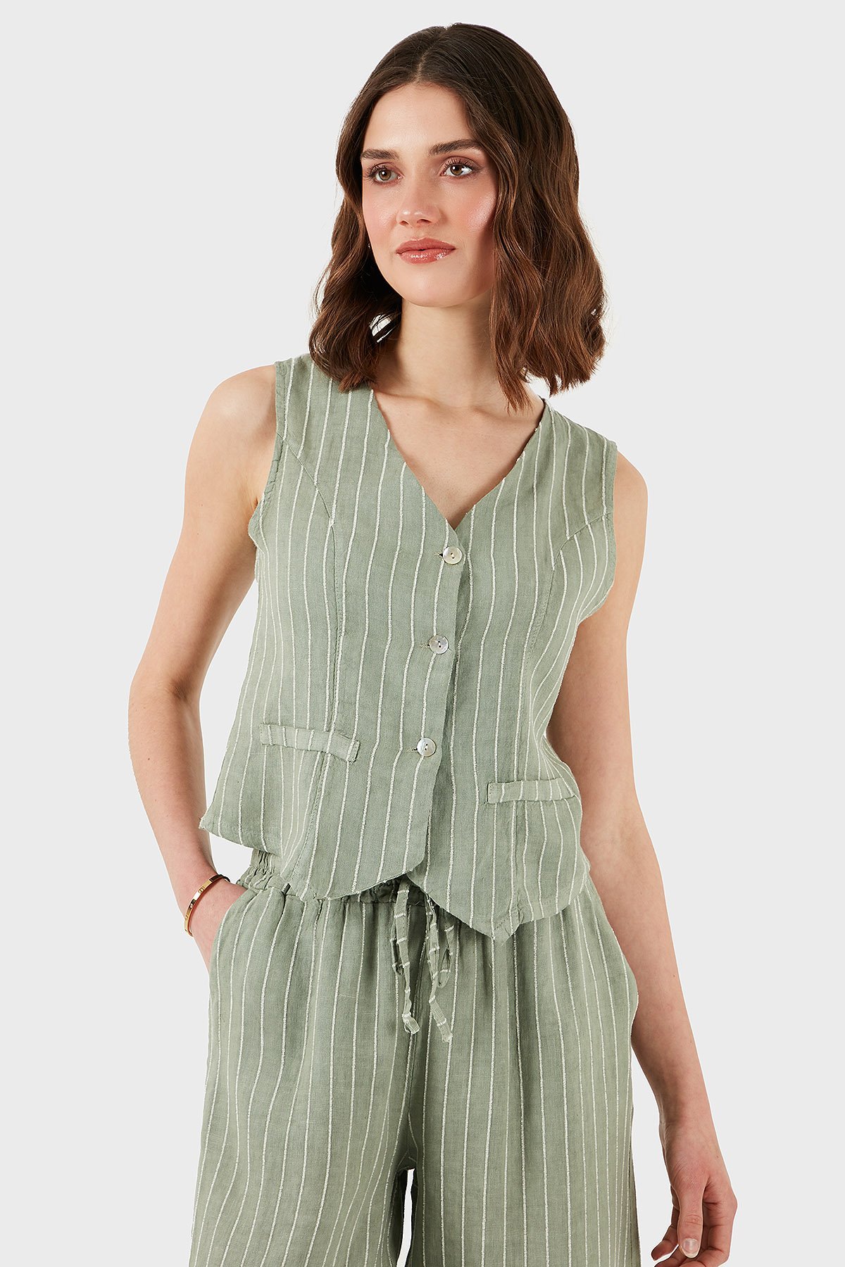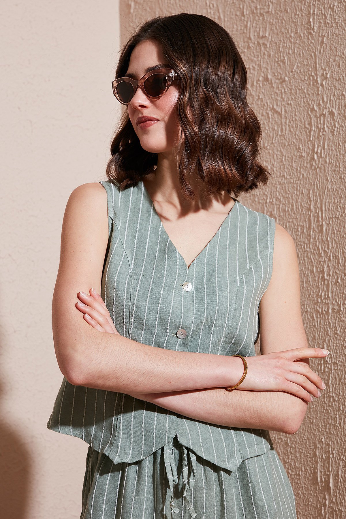 Çizgili Regular Fit V Yaka Keten Bayan Yelek 6333544 HAKİ